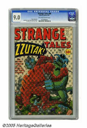 <B>Strange Tales #88 (Marvel, 1961) CGC VF/NM 9.0 Off-white to white pages.</B></I> "Zzutak, The Thing That Shouldn't Exist" was one of Marvel's most memorable monster tales! And it was done by three memorable creators, too -- penciler Jack Kirby, inker Steve Ditko, and writer Stan Lee. In the story, a monster-mag artist is under pressure to come up with a new creature that tops all of his previous efforts, when a stranger appears offering three-dimensional paint that can make his creations come to life! You can probably guess the rest... Kirby and Ditko teamed up for the cover as well, and there's also a story penciled by Ditko as well as one by Don Heck. If you have Groot, Grottu, and Fin Fang Foom in your collection, you owe it to yourself to get Zzutak! Overstreet 2005 VF/NM 9.0 value = $182; NM- 9.2 value = $245. CGC census 6/05: 1 in 9.0, none higher.