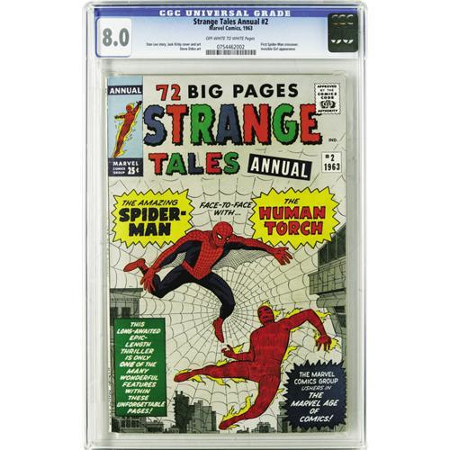 <B>Strange Tales Annual #2 (Marvel, 1963) CGC VF 8.0 Off-white pages.</B></I> This was Spider-Man's first crossover appearance and just his fourth appearance overall! Spidey was so new to this superhero stuff, he forgot to bring his chest logo! The Webslinger battles the Human Torch in a story with Jack Kirby and Steve Ditko art. The rest of the book consists of Atlas reprints with art by Kirby, Ditko, Don Heck, Joe Sinnott (pencils), John Buscema, and Dick Ayers. Overstreet 2006 VF 8.0 value = $578. CGC census 4/06: 10 in 8.0, 24 higher.