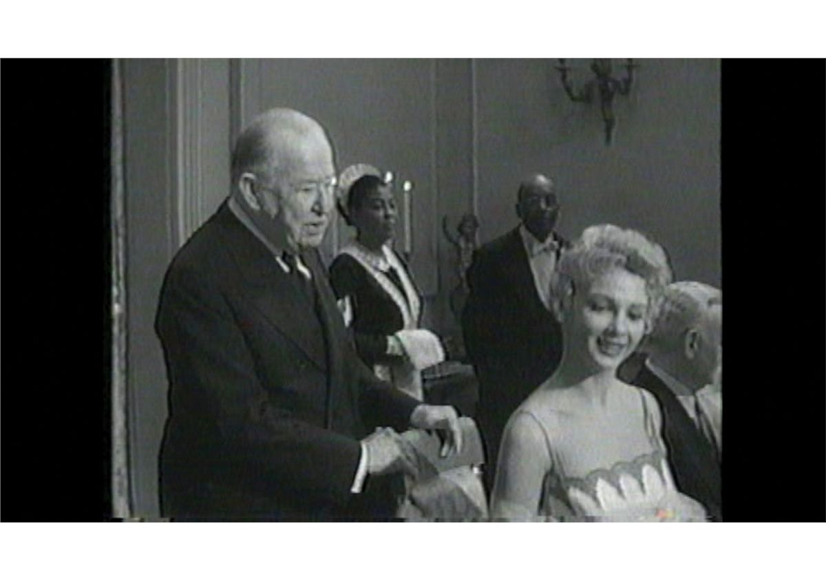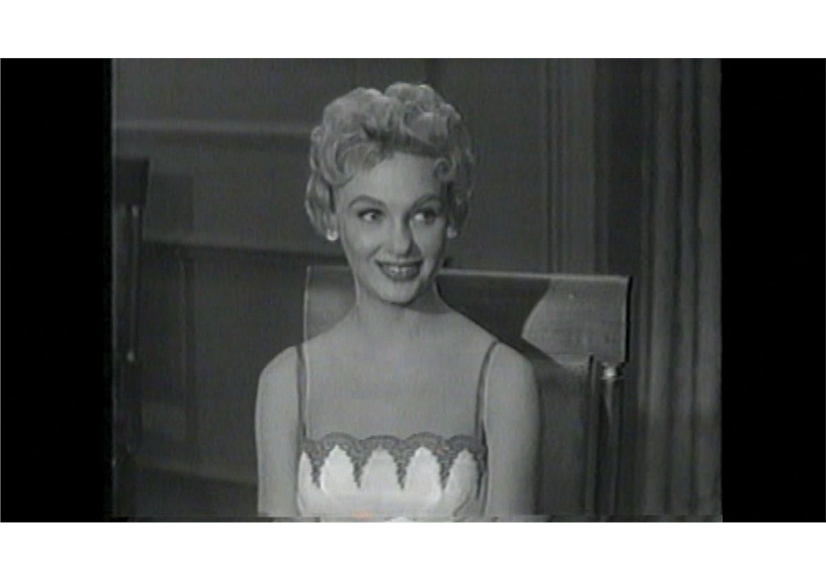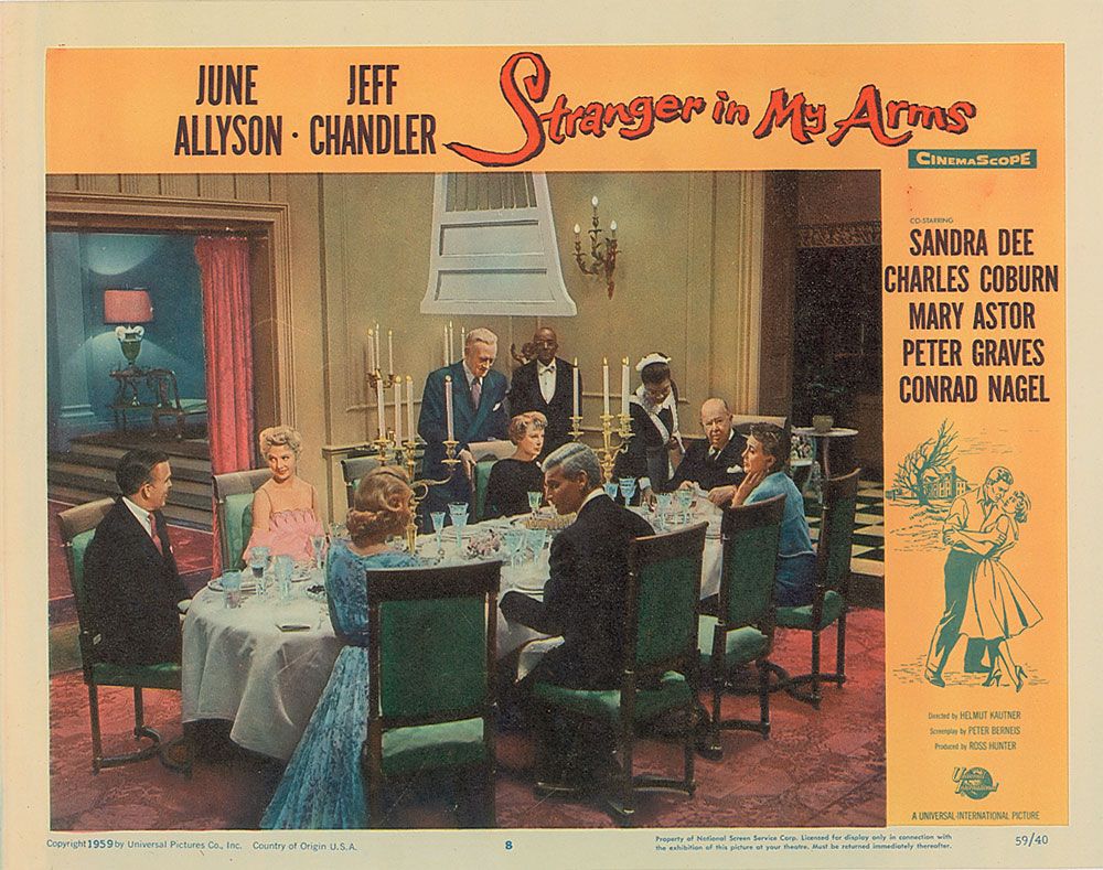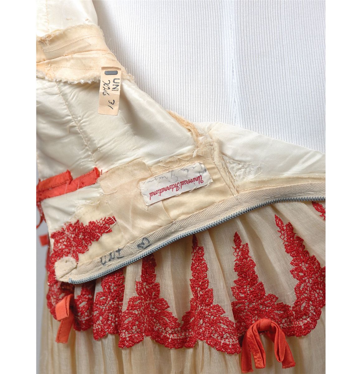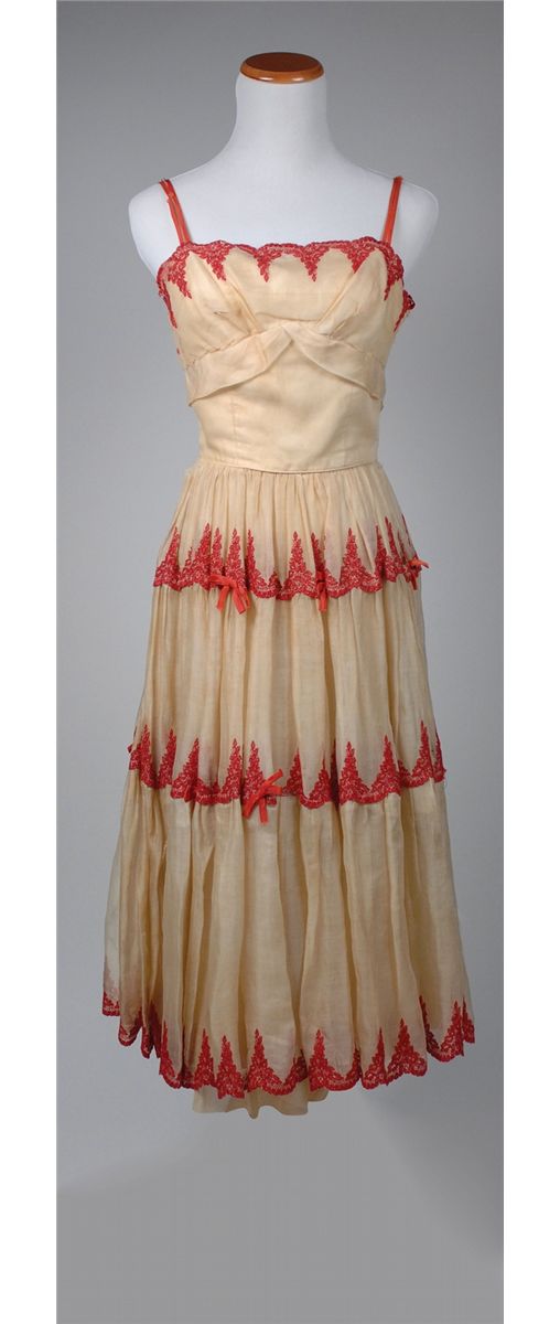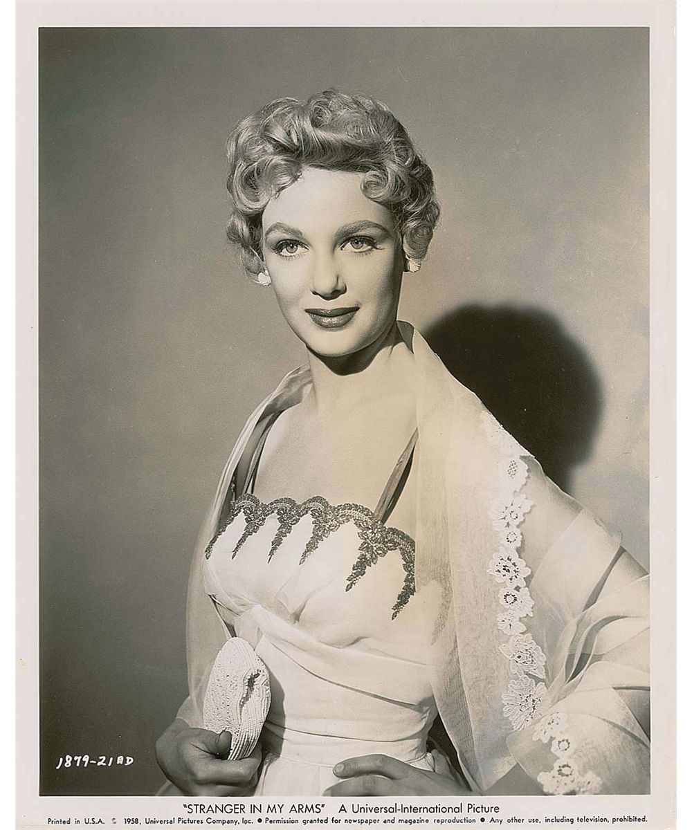 Green’s screen-worn dress from the 1958 Universal film Stranger in My Arms, starring Jeff Chandler and June Allyson. Cream silk sleeveless cocktail dress with chiffon overlay and red embroidered trim with spaghetti straps and a built in petticoat. Dress has a Universal International label sewn inside with Green’s name and a studio cleaning tag. Accompanied by a Universal Pictures promotional portrait photo for the film showing Green in the dress and an original lobby card picturing her in the dress as well. Worn during the dramatic dinner scene of the film. In very good condition, with several areas of wear and separations to outer layer of material. A second-generation DVD copy of the film is also included.