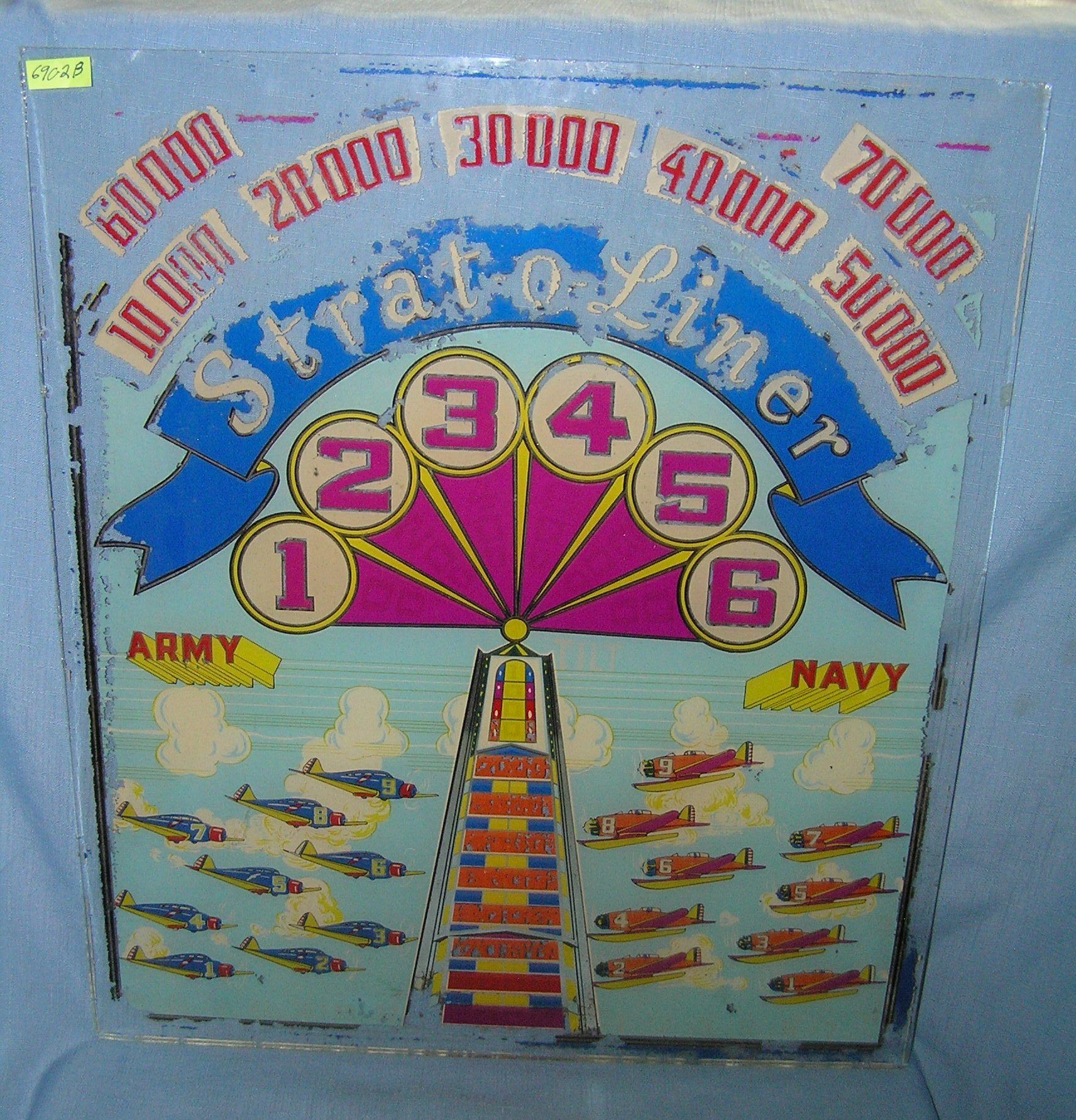 Strat-O-Liner pinball machine reverse painted glass front display 19 inches wide by 22 inches long circa 1950s est. value $300.00-$350.00