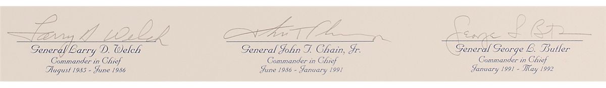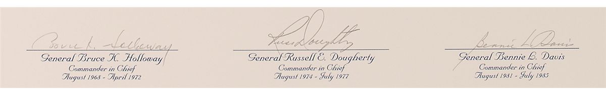 Color 31 x 19 print entitled ‘Peace…Is Our Profession,’ signed in pencil by six former S.A.C commanders: Bruce Holloway, Russell Dougherty, Bennie Davis, Larry Welch, John Chain, and George Butler. Also signed in pencil by the artist, Mike Hagel. In fine condition.