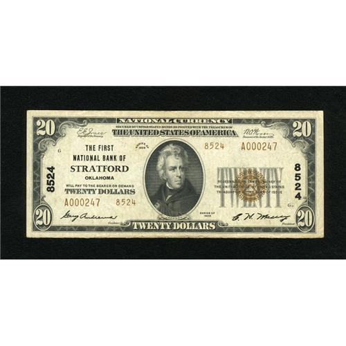 <B>Stratford, OK</B></I> - $20 1929 Ty. 2 <B>The First NB</B></I> Ch. # 8524<BR>The paper on this piece is solid and the overprint is still especially bold. In a holder it appears fully AU. <B>Very Fine.</B></I><BR><BR><b>Shipping:</b> Coins & Currency (<a target="_blank" href="http://www.heritageauctions.com/common/shipping.php">view shipping information</a>)