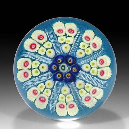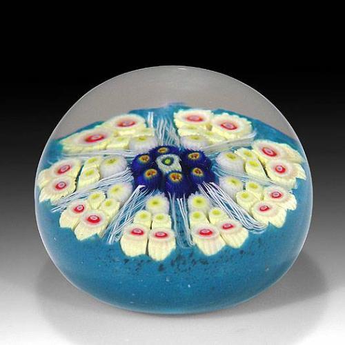 Strathearn Glass millefiori panels and spokes paperweight. A white and green cane is centered by a ring of blue and yellow canes, and surrounded by eight, spaced, white, latticinio spokes, dividing panels of pale yellow canes, on semi-opaque blue ground. Diameter 2 15/16".