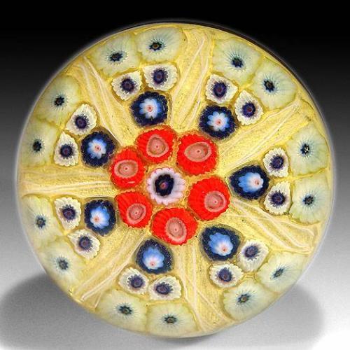 Strathearn Glass millefiori and latticinio spokes paperweight. A white, blue, and red center cane is encircled by a ring of red and white cog canes, which are surrounded by seven spaced spokes of fine white latticinio, dividing panels of assorted canes, on opaque pale yellow ground. Diameter 3".