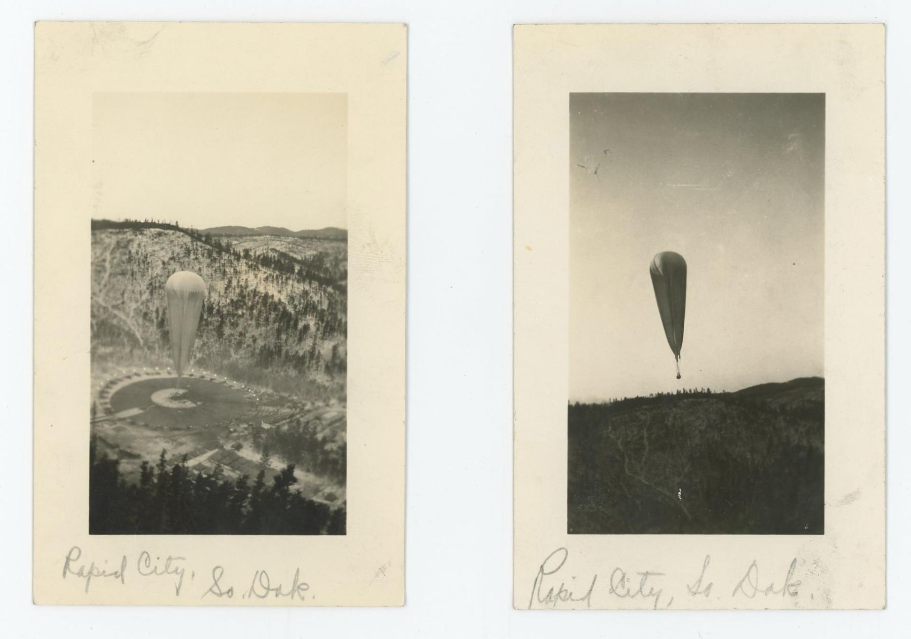 Both photos on these postcards were taken by the Mattson Studio in Rapid City, South Dakota. The 1930s Stratobowl balloon launches near Rapid City, South Dakota, were groundbreaking high-altitude scientific missions conducted in 1934 and 1935 by the U.S. Army Air Corps and National Geographic Society. Using giant helium balloons, the Explorer I and Explorer II flights aimed to study the upper atmosphere and test human survival at extreme altitudes. The 1935 flight reached about 72,000 feet, setting a world record and providing early observations of Earth’s curvature. These highly publicized launches drew large crowds and marked a major step toward modern aviation and space exploration.