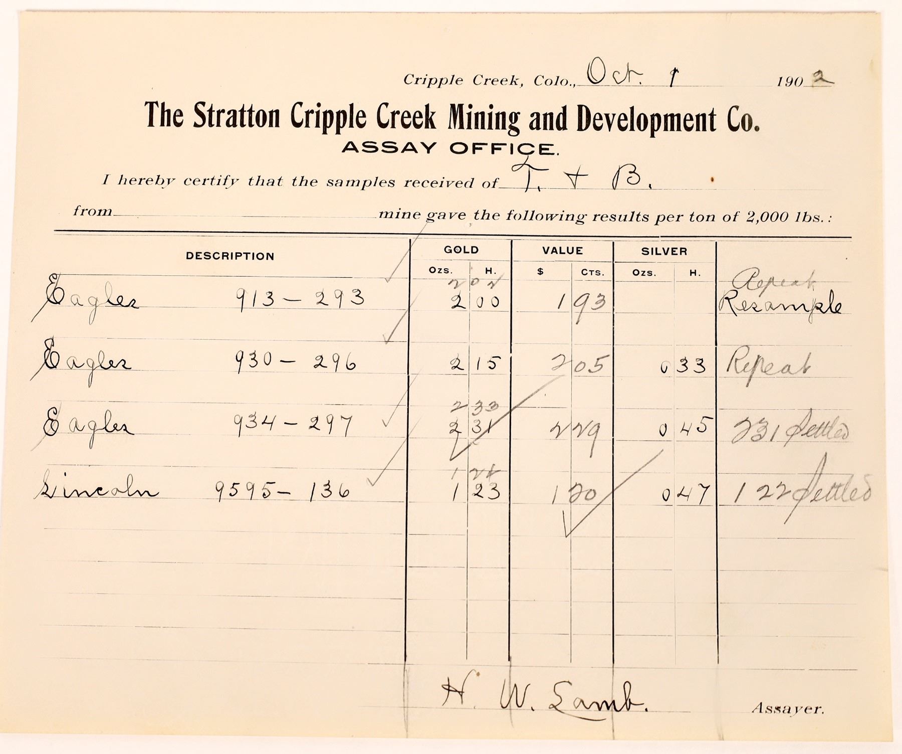 Rare. Four samples taken by this company on Oct. 1, 1902. Three on the Eagles and one on the Lincoln. Signed by HW Lamb, assayer. 6.25 x 7.5" W. S. Stratton established the Stratton Cripple Creek Mining and Development Company under which he consolidated his extensive land holdings in the Cripple Creek Mining District at the turn of the 19th century. Stratton's Independence Mine and Mill is a historic gold mining site near Victor, Colorado on the south slope of Battle Mountain. Between late 1893 and April 1899, approximately 200,000 ounces of gold was removed from the Independence Mine. He was also involved in a law suit with the Portland Mining Company. Cripple Creek Colorado 1902