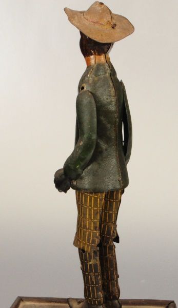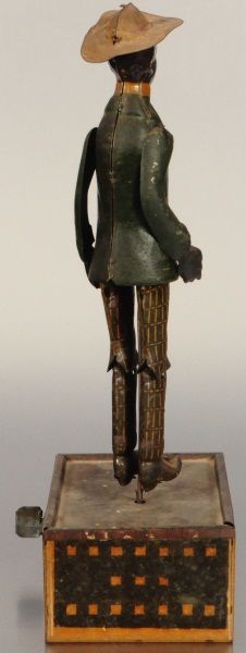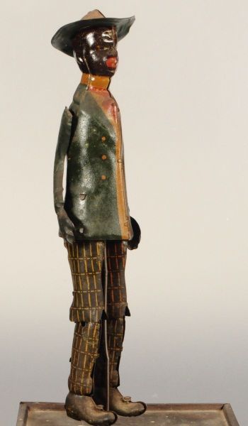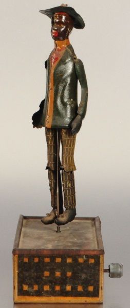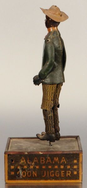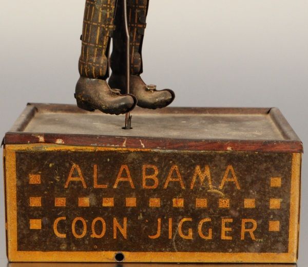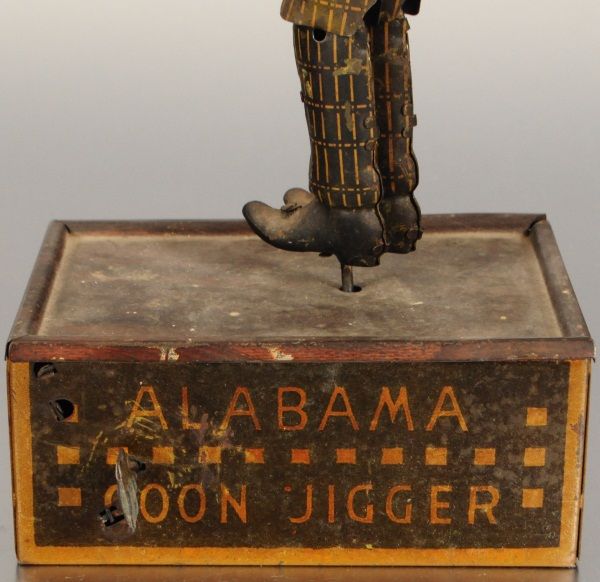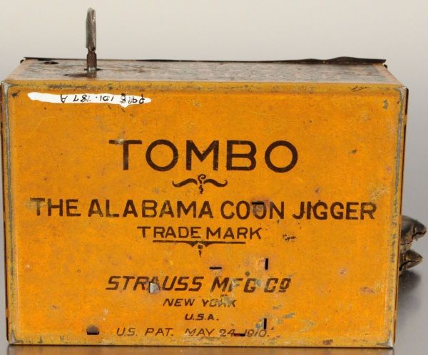 Strauss The Alabama Coon Jigger Tin Toy Wind-Up. "Srauss Mfg. Co. New York U.S.A." One arm is present, but unattached, small connecting tab is gone. Measures 5" W x 3-1/4" D x 10" H.