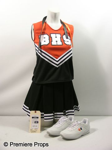 This is a screen worn Amy (Kate Bosworth) cheerleader outfit from the 2011 thriller 'Straw Dogs.' The film tells the tale of a couple (James Marsden, Kate Bosworth) who move to the deep south only to find the locals really do not want them there. The costume consists of a black, white & orange 'Teamwork' cheerleader top with 'BHS' embroidered on front, a black and white striped 'Cheerleading Company' cheerleading skirt with black and orange ribbons, and a pair of white "Kaepa' running shoes with matching orange and black design . Includes studio wardrobe tag.