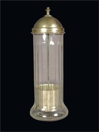 Straw Holder Tin and Glass, patent August 22, 1915. No chips or cracks. 12 1/2 inches tall.