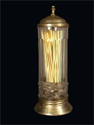 Straw Holder Tin and Glass. No chips or cracks. 12 1/2 inches tall.