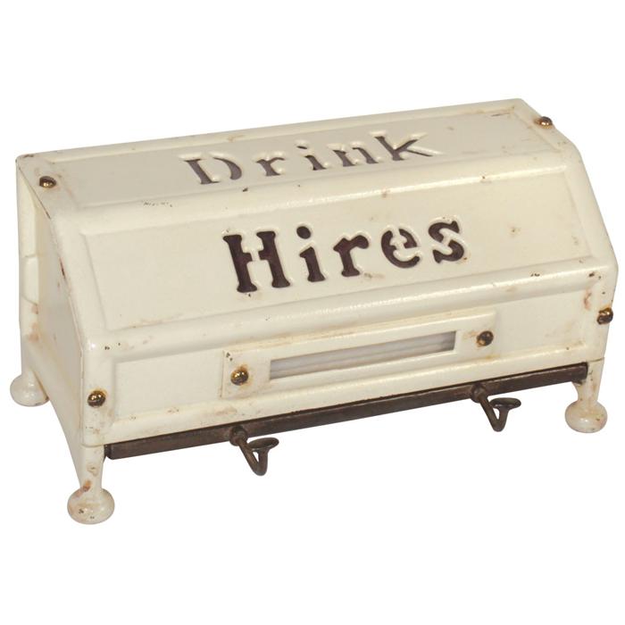 Straw holder, Hires, Rare horizontal cast iron holder w/ruby glass inserts, dated Nov 14, 1911, one insert cracked but break is not visible to outside, o/wise Exc cond, 5"H x 9.75"W.