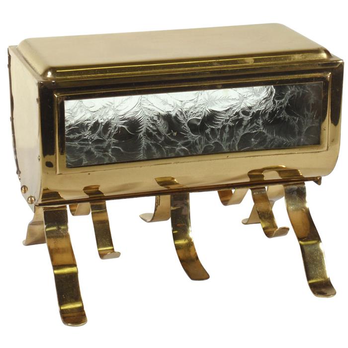 Straw holder, Monarch, footed brass horizontal w/etched glass inserts, straws dispense from both sid