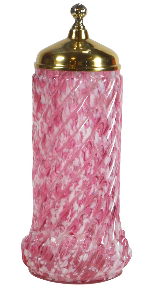 Straw holder, cranberry & white swirl w/nickel-plated lid, ground lip & bulbous base, unusually large, 14.25"H x 5.75"Dia at bottom.