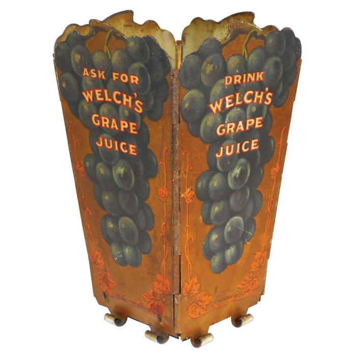 Straw holder for Welch's Grape Juice, litho on flared diecut metal w/adv on all sides, a Rare early