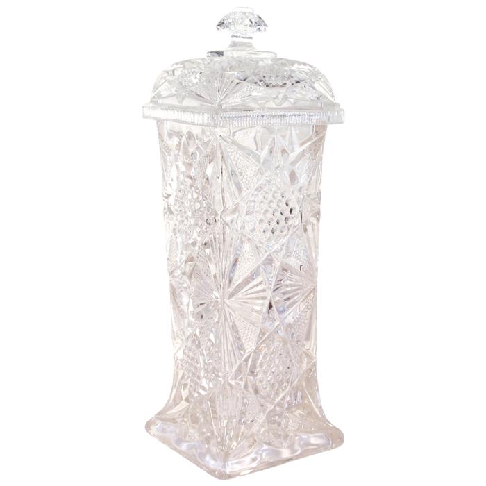 Straw holder, heavy pressed clear glass w/lid, Illinois pattern, flared bottom, Exc cond, 12.5"H.