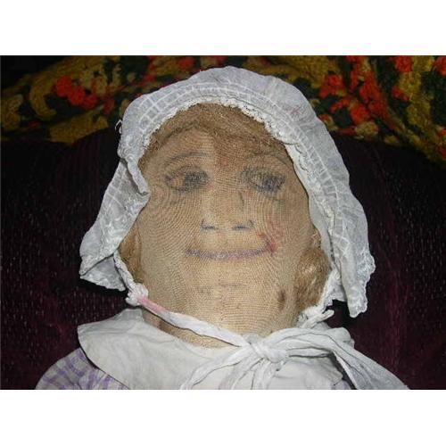 This is a large doll. She is made of cloth but is straw stuffed. I'm guessing she has ink/pen features. It's not oil paint. She has a seam down the front of her face and down the back of her head. The hair is only tacted on across the top and sides of the face. The bonnet covers the rest of the bald head. You can tell that's how it has always been. The head is seamed to the body at the neck. It's very tight and was sewed on a machine. The arms have a wire in them as when one move so does the other. She's about 21" around her belly. At some time someone has put a piece of older material around the knee areas to reinforce legs. It looks good to me. The face has some soil but just gives her character. The cotton check dress is old but is too small to button around her neck. She has on an old pair of cotton pantaloons, old socks, and an pair of old shoes with one side button. Doll is sold as is. Some little girl must have loved this huge girl! She is from a smoke free environment. She's quite heavy with the straw packing. Buyer to pay $25 for shipping, insurance and handling. Thanks for viewing.