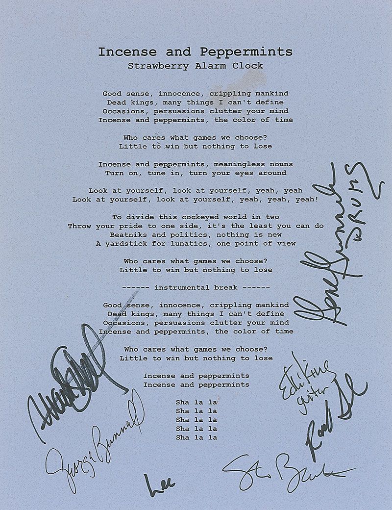 Color glossy 10 x 8 psychedelic group photo, signed in black felt tip by five original members, Steve Bartek, Randy Seol, George Bunnell, Mark Weitz, and Gary Lovetro; and souvenir lyrics to ‘Incense and Peppermints,’ on an 8.5 x 11 sheet, also signed by all five. In fine condition, with a spot of toning to the souvenir lyrics page.