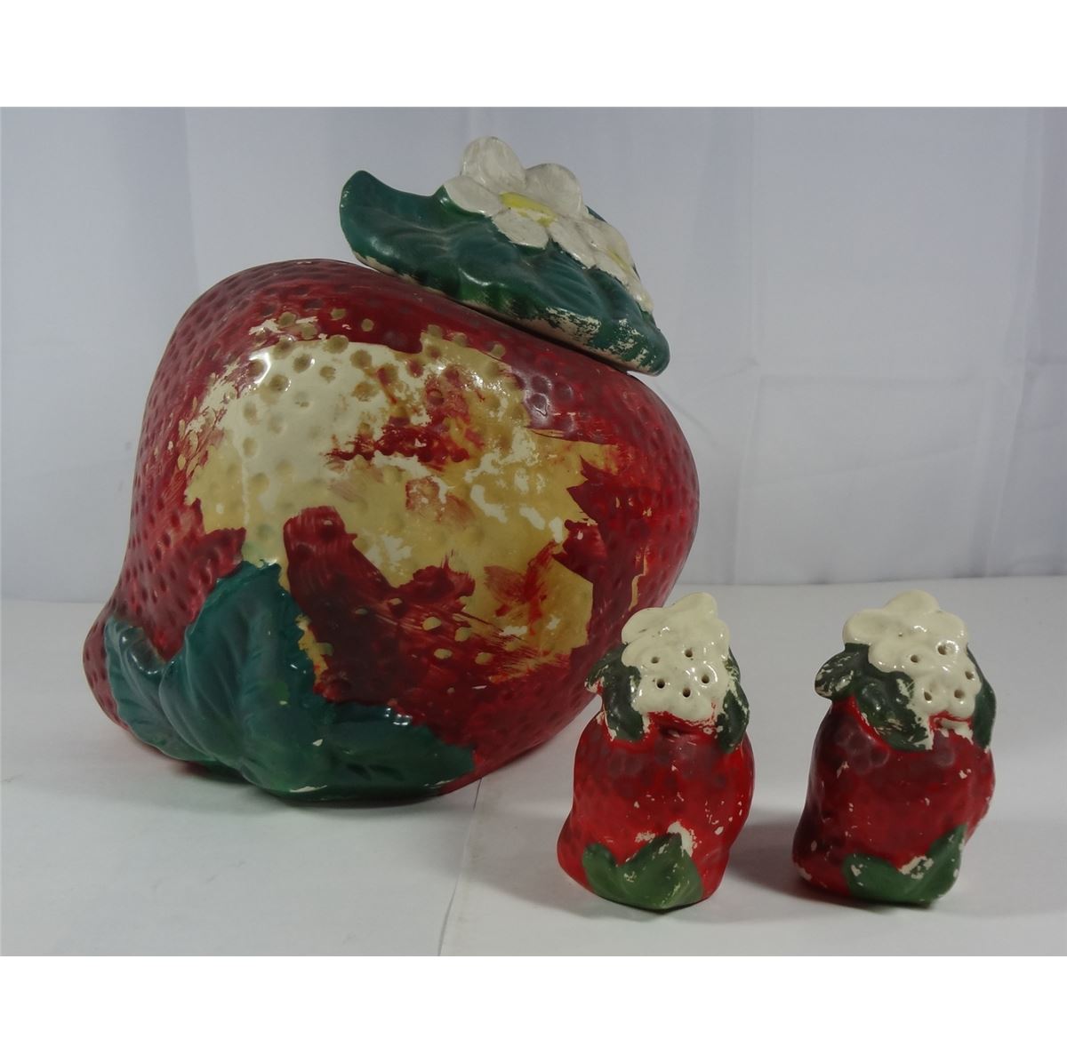 Vintage Strawberry Cookie Jar! Including Salt and Pepper Shakers! Marked "Sears Exclusive USA". Est. $75-$95