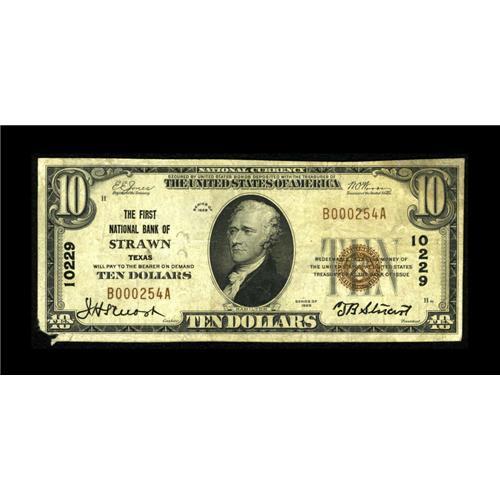 <B>Strawn, TX</B></I> - $10 1929 Ty. 1 <B>The First NB</B></I> Ch. # 10229<BR>Strawn is located in Palo Pinto County and named for Bethel Strawn, who helped settle the area in 1875. Oil and gas production are the economic mainstays here, although the town never developed into much more than a wide spot in the road, with a population peak of just 1000 back in 1940. Just two large and three small notes are known from this bank, with one of the large notes forever impounded in the Philpott/Moody holdings. <B>Fine,</B></I> with the bottom left margin a bit chewed into.<BR><BR><b>Shipping:</b> Coins & Currency (<a target="_blank" href="http://www.heritageauctions.com/common/shipping.php">view shipping information</a>)