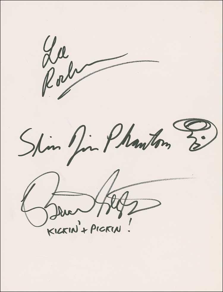 Handwritten lyrics to the first verse of “Blast Off”, written out by Brian Setzer on an off-white 8.5 x 11 sheet, signed on a second sheet by Brian Setzer, Slim Jim Phantom, and Lee Rocker; and a color glossy 10 x 8 group photo, signed in gold and silver ink by all three members. In fine condition. RRAuction COA.
