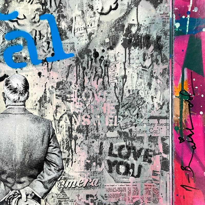 "Street Connoisseur" is a unique (UNIQ) mixed media on deckle edge paper by Mr. Brainwash, hand signed and bearing the thumbprint of the artist inverso. This piece comes custom framed. Includes Certificate of Authenticity. Measures approx. 20" x 24" (frame), 16" x 20" (image).