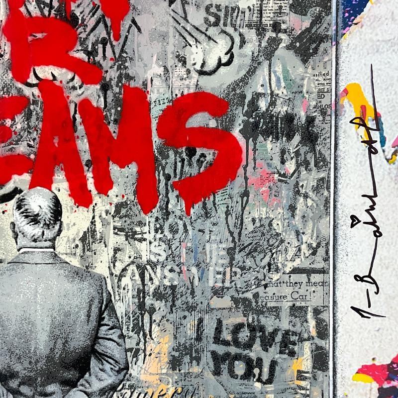 "Street Connoisseur" is a unique (UNIQ) mixed media on deckle edge paper by Mr. Brainwash, hand signed and bearing the thumbprint of the artist inverso. This piece comes custom framed. Includes Certificate of Authenticity. Measures approx. 20" x 24" (fram