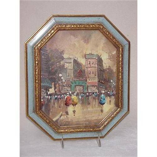 An oil painting on art board, 12 1/2" X 10 1/2" framed. Paris street scene, unsigned, probably painted in the 1960's. Atractive painted wood frame. Condition is very good.