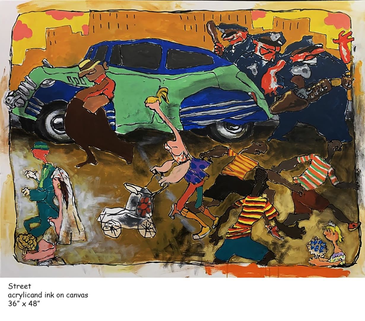 The Street is full of characters and Cops in Stephen Holland's whimsical, colorful world. A 36x38" original acrylic & ink on canvas w/COA