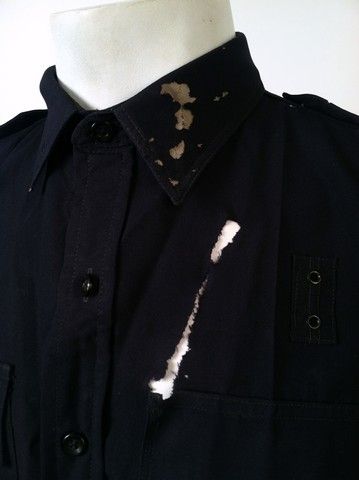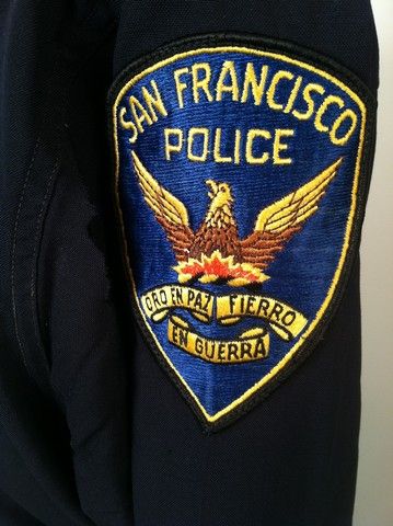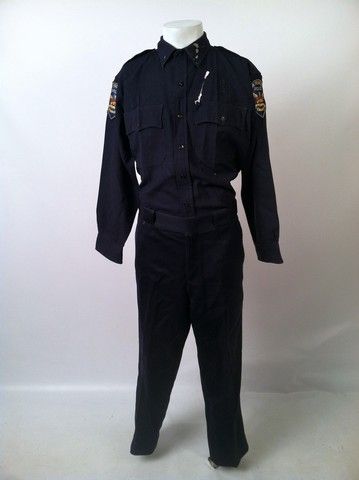 From 1972 to 1977 Karl Malden and a young and very intense Michael Douglas ran the "Streets Of San Francisco" as cops, in this hit TV Series. This is an actual background San Francisco Police Officer dark navy uniform. It was used in several shout-out stunt sequences, what with its collared long sleeve uniform shirt which shows wear and holes and other signs of bullet action. On both arms are the official San Francisco Police patch with their motto "Oro En Paz - Fierro En Guerra" ("Gold in Peace - Iron In War"). Includes both the heavy uniform shirt and the uniform pants.