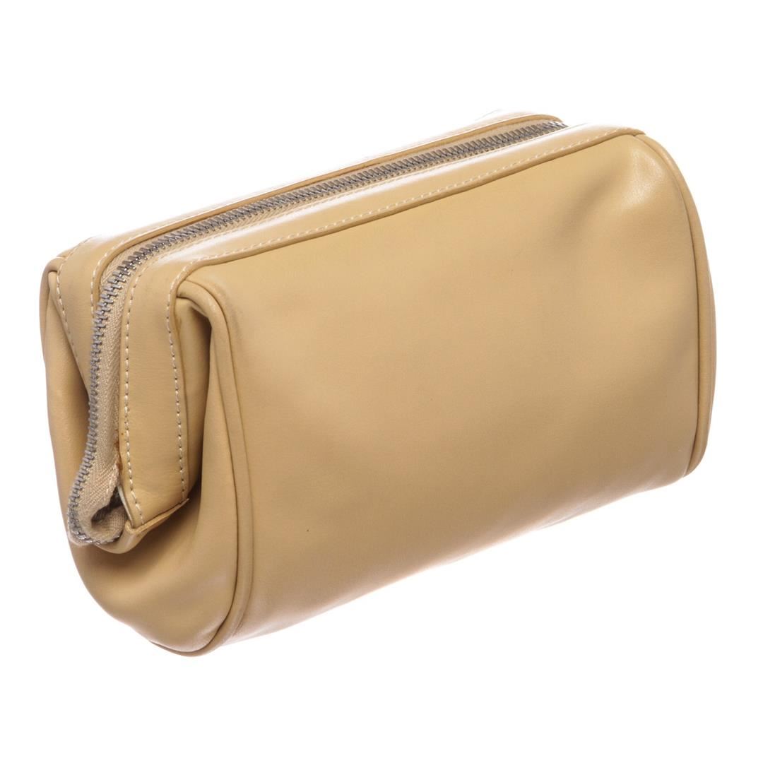 Overall zipper closure. Interior is fabric lined with one side slip pocket. Item is pre-owned. Item Dimensions: 7.25"x2.75"x5"/18.4cmx6.9cmx12.7cm.
