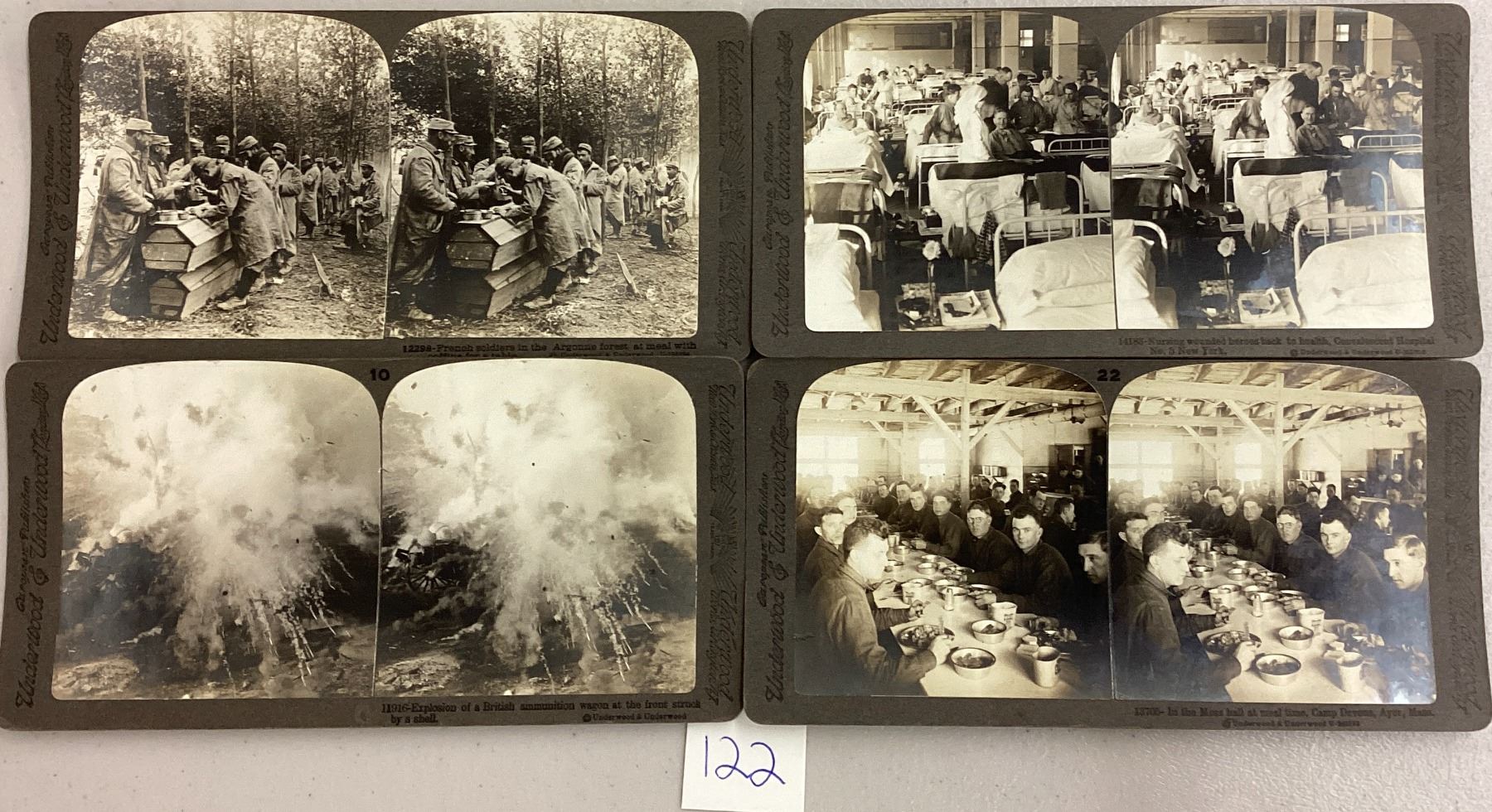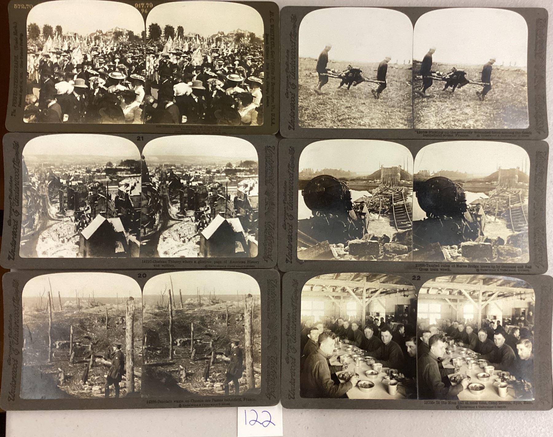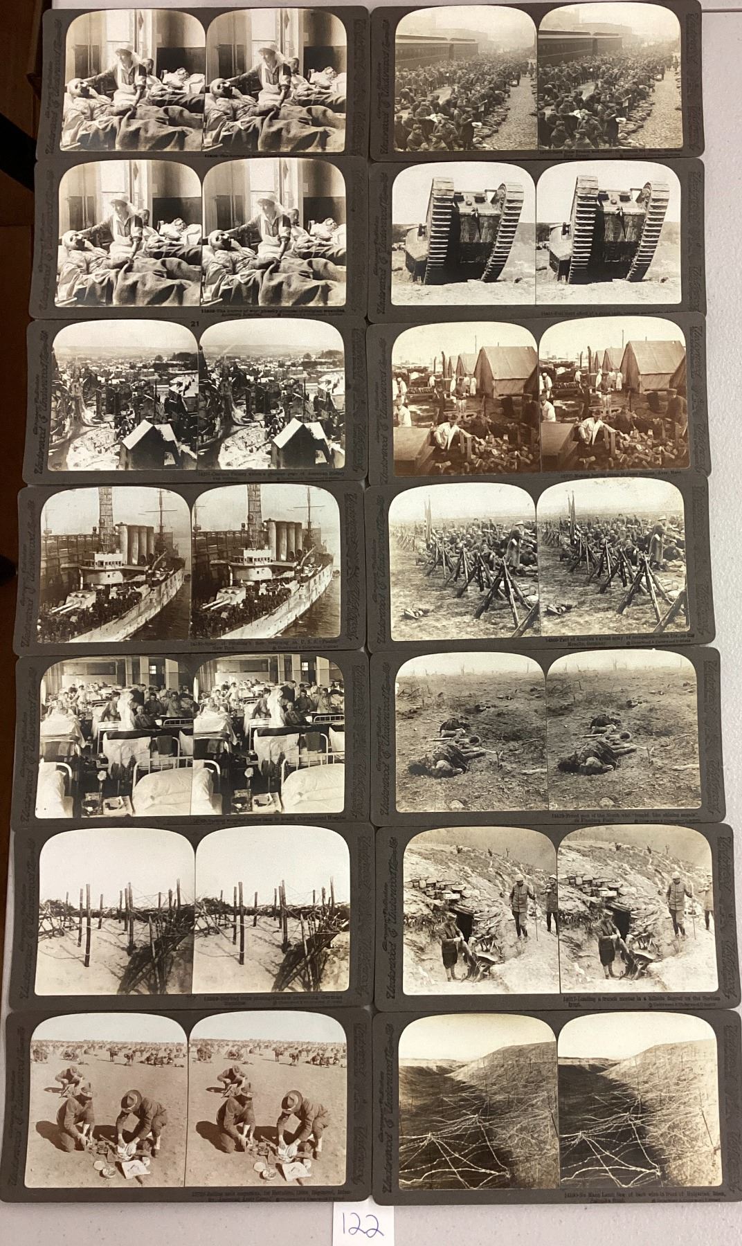 Box of 38 Underwood and Underwood real photo stereoviews with box. Vehicles, battlefields, etc.