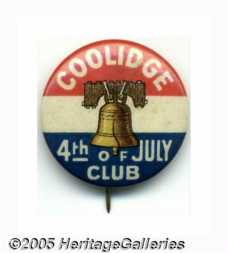 <B>Striking 7/8" Liberty Bell Design for Calvin Coolidge</B></I> Scarce and colorful, and in excellent shape. One of the few opportunities to brighten up your display of dull 1920s buttons. Lot:262
