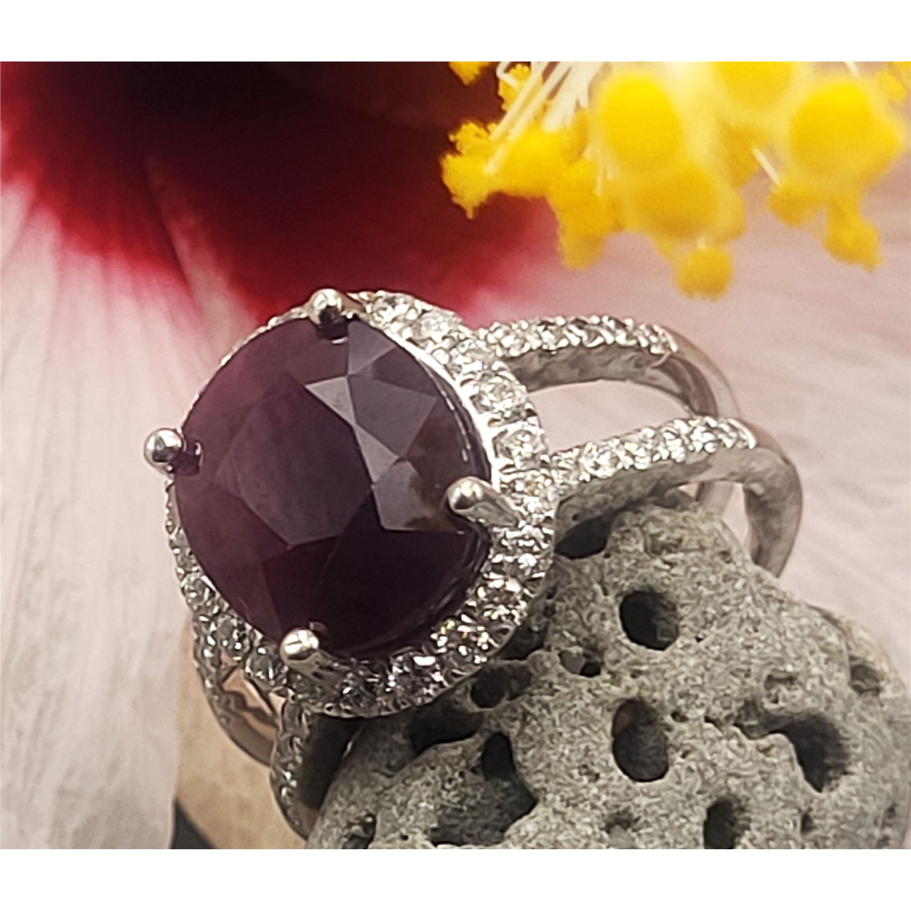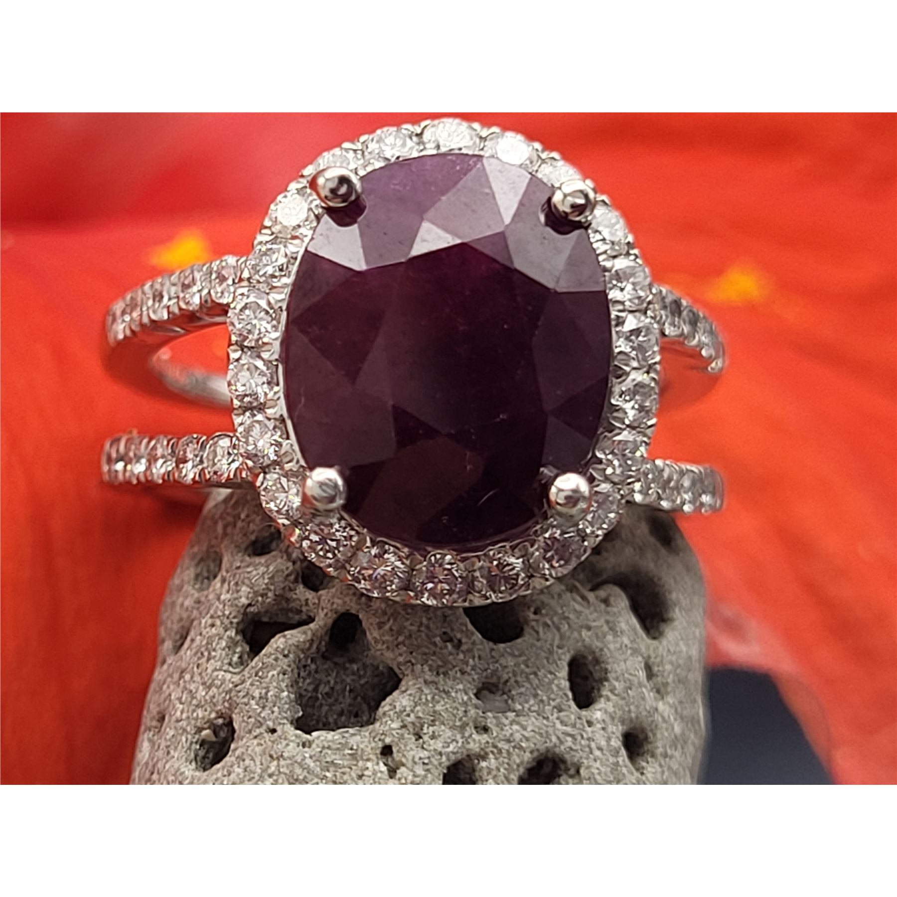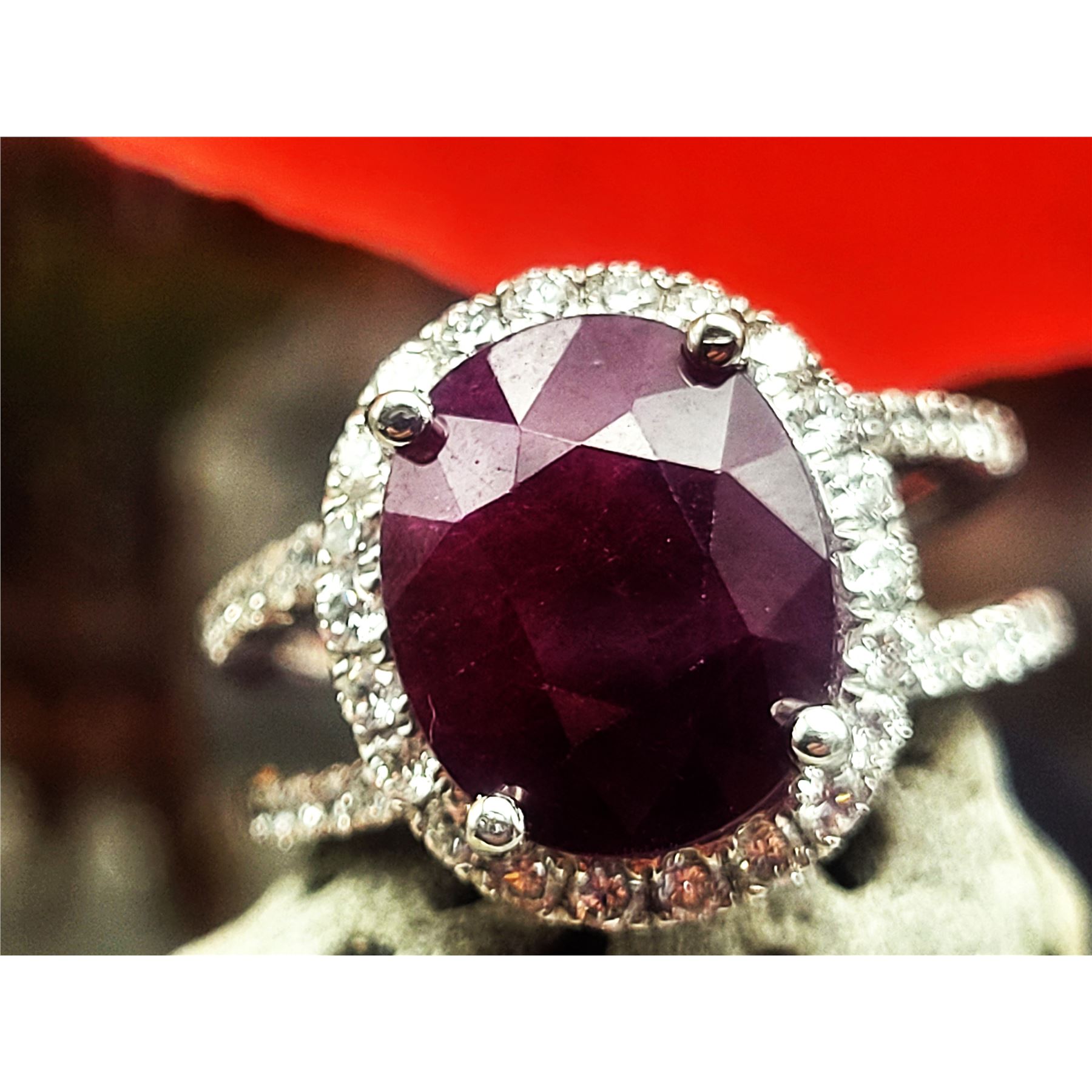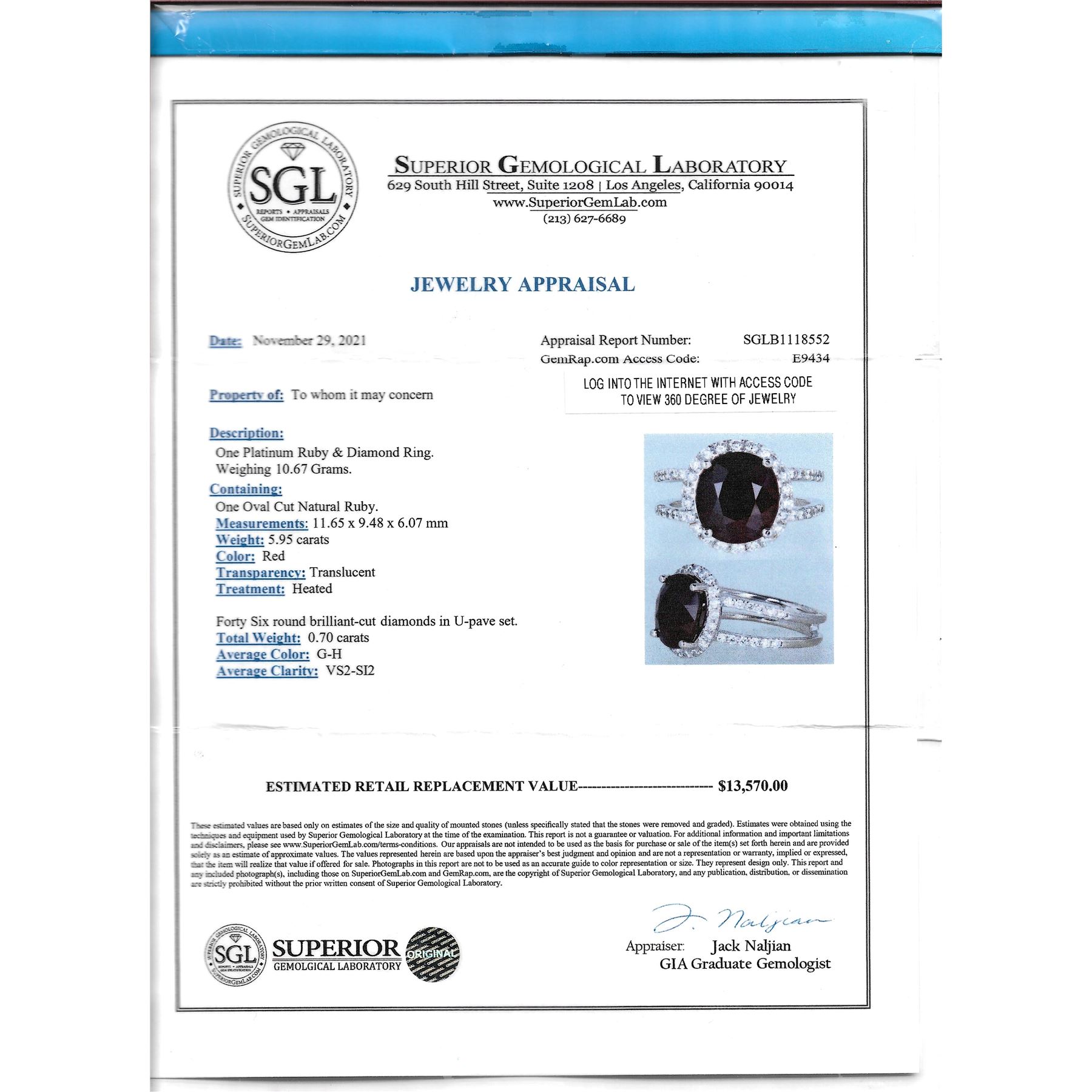 This certified and appraised platinum ring emotes elegance with the trendy dual-shank design and glittering diamond halo.& nbsp; The 5.95 carat, oval-cut, burgundy red, translucent, genuine ruby is prong-set in fine platinum with .70 carats of round, brilliant-cut, G-H color, VS2-SI2 clarity diamonds in the sparkling halo and along the four shoulders.& nbsp; The dual shanks taper to a single shank and the ring is US size 6 and can be sized for an additional charge, if desired.