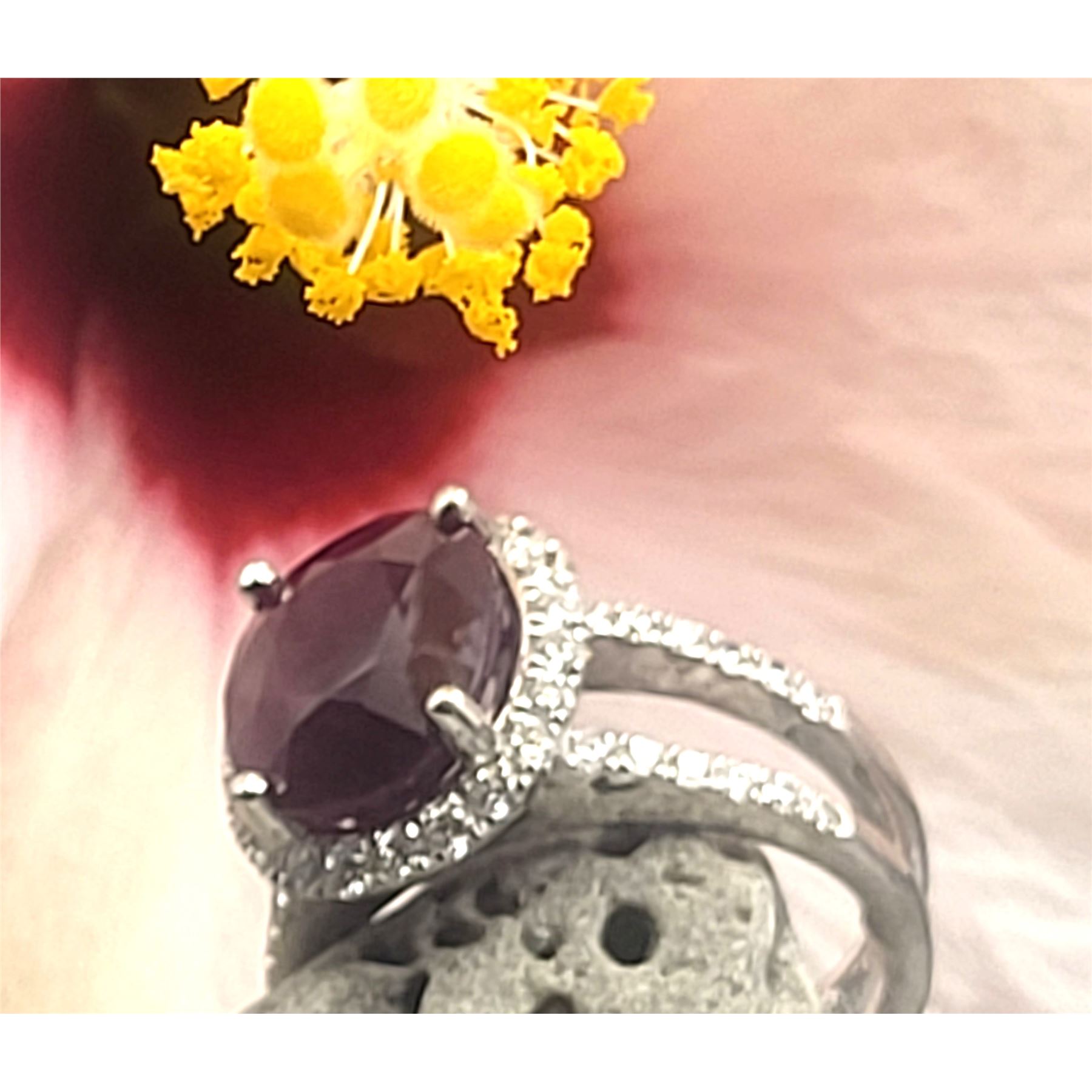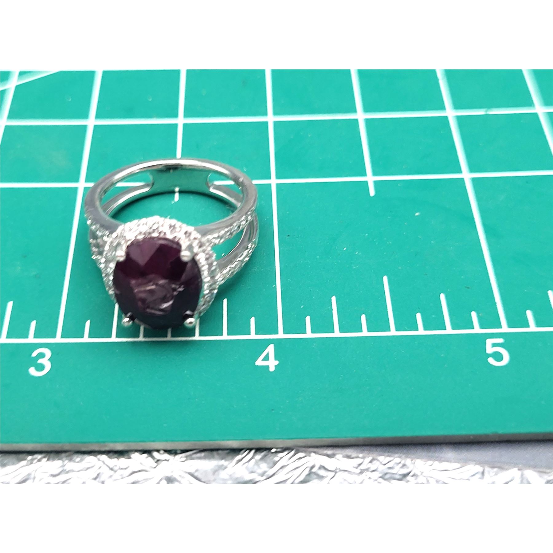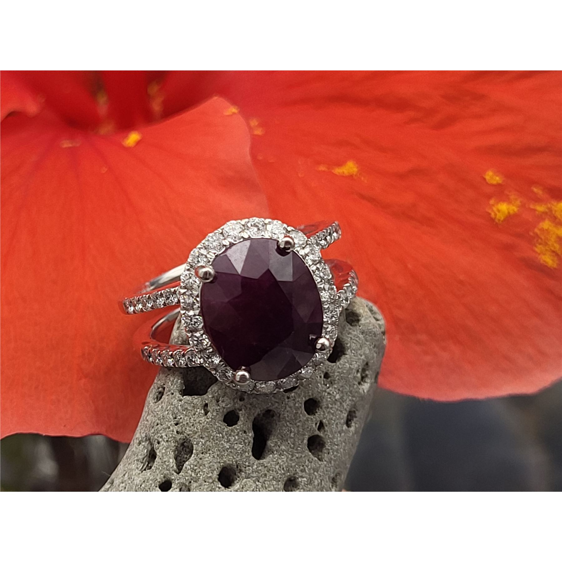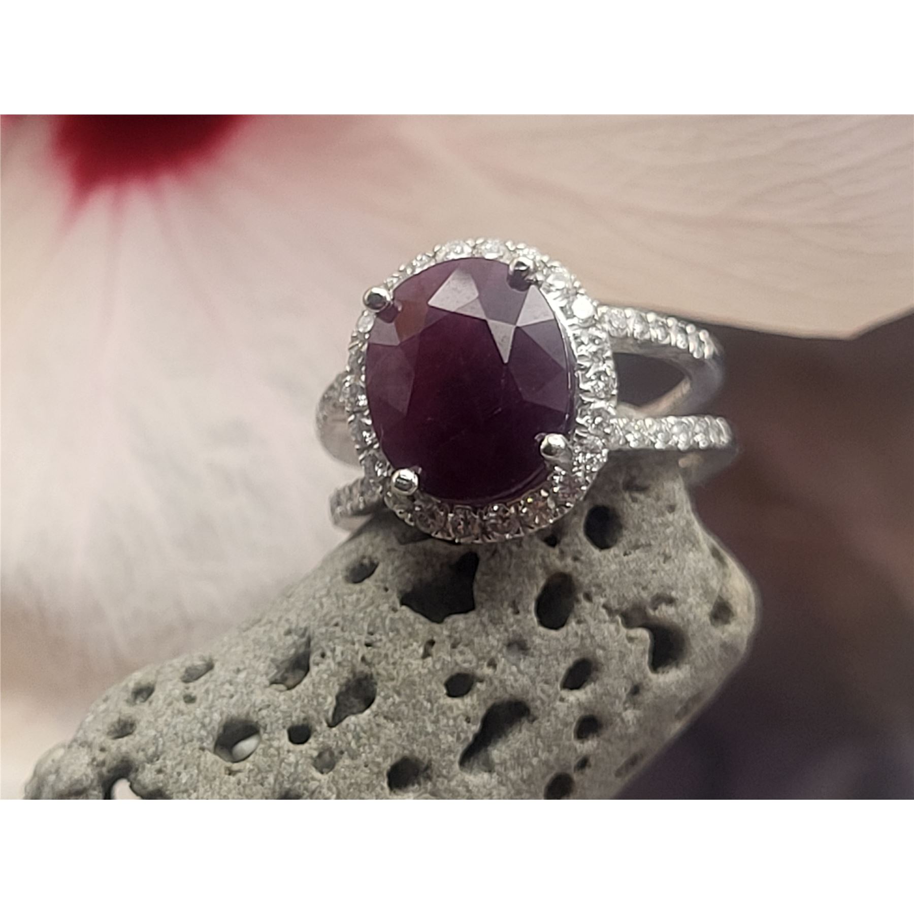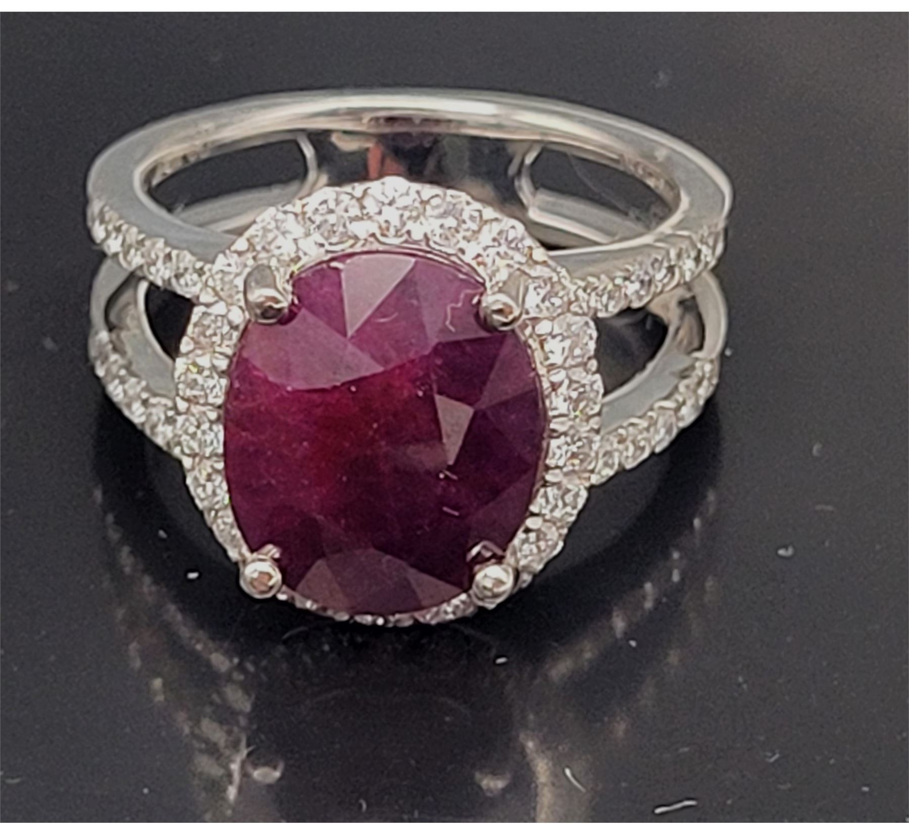 This certified and appraised platinum ring emotes elegance with the trendy dual-shank design and glittering diamond halo.& nbsp; The 5.95 carat, oval-cut, burgundy red, translucent, genuine ruby is prong-set in fine platinum with .70 carats of round, brilliant-cut, G-H color, VS2-SI2 clarity diamonds in the sparkling halo and along the four shoulders.& nbsp; The dual shanks taper to a single shank and the ring is US size 6 and can be sized for an additional charge, if desired.