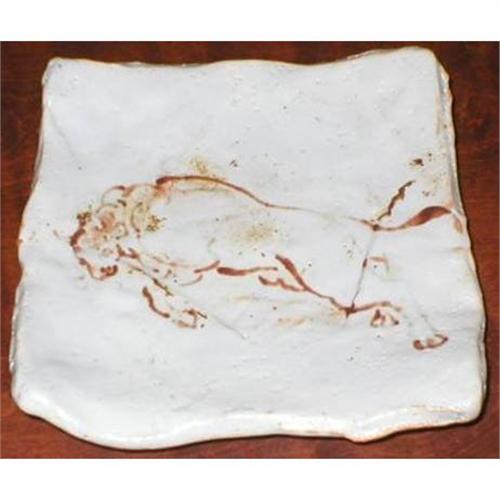 Ito Tankyo is a fourth generation Shino potter. His mastery of the medium is evident in this wonderful E-Shino (picture shino) piece with a powerful depiction of a running ox. 8.75 x 8.75 x 2 inches, 22 x 22 x 5 cm. Mint Condition.
