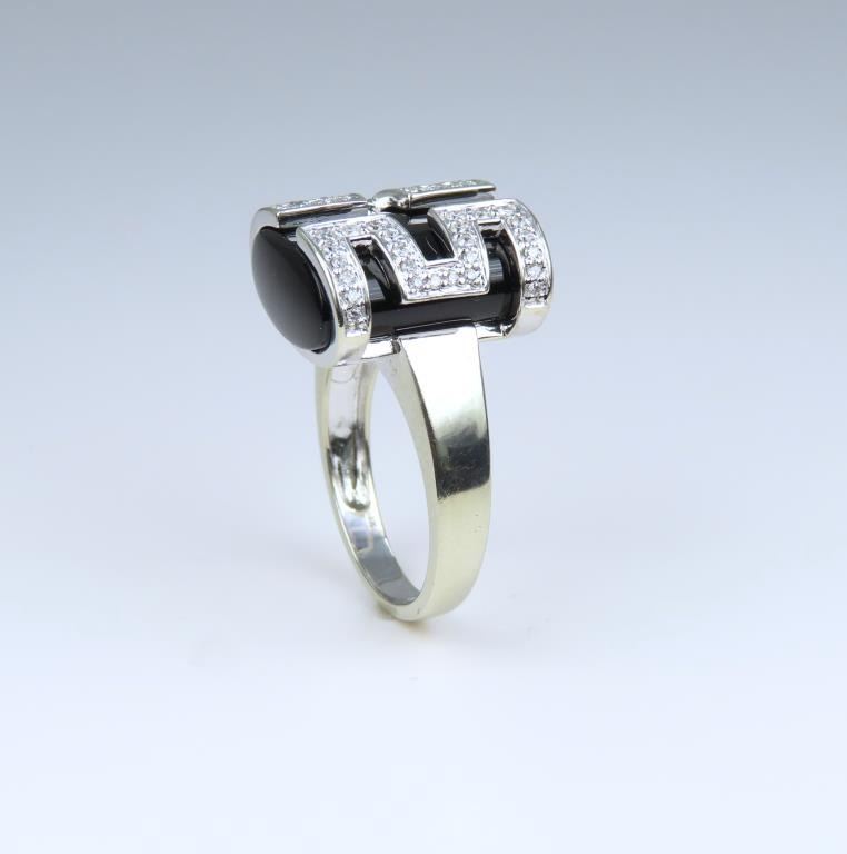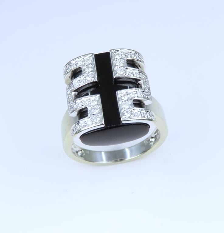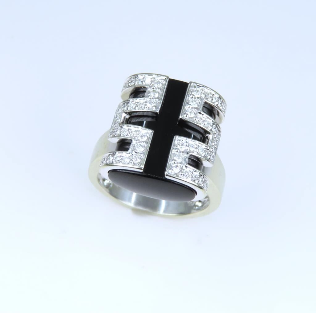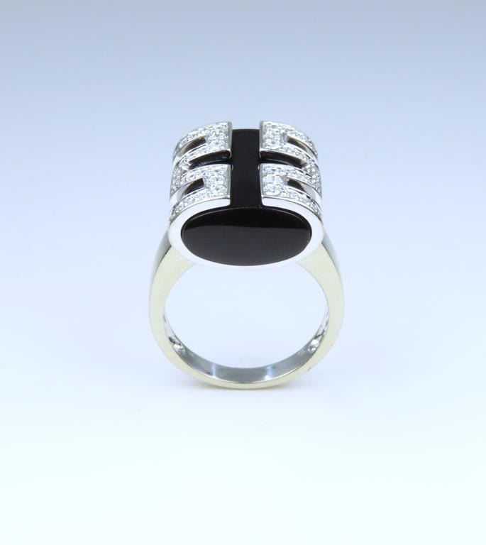 Ring featuring a uniquely cut Onyx piece wrapped in a stylish design pave set with 52 round cut Diamonds weighing approx. 0.50 carats with H-I colors and VS clarity. High quality custom setting crafted in 14 karat white gold, ring size 7. Retail $5,000-$6,000