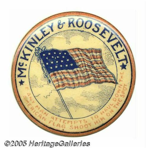 <B>Striking Large 1 1/2" 1900 William McKinley and Theodore Roosevelt Button</B></I> Very rare variety with only several known and one of the nicest non-portrait designs of the era. In small red letters at bottom is the slogan, "Any man attempts to haul down the American flag shoot him on the spot." Excellent condition. Auction records to over $1,500. Lot:260