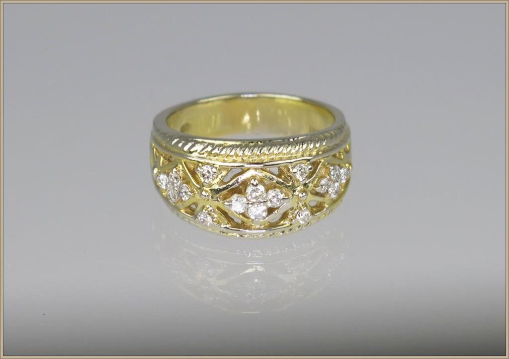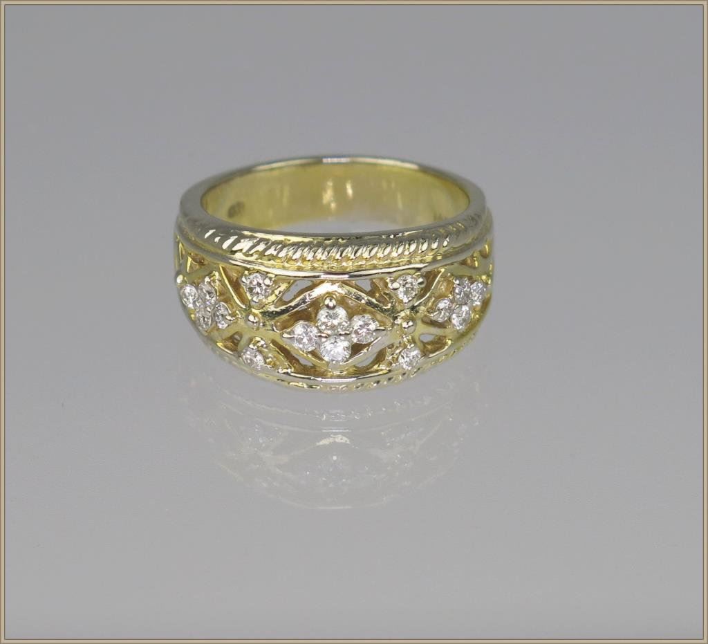 Striking Mosaic Patterned Diamond Ring with 16 round brilliant cut Diamonds weighing approx. 0.30 carats with F-G colors and VS/SI clarity set in 7.10 grams of 14 karat yellow gold. Retail $1,800-$2,200 Estimate $900-$1,200