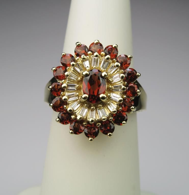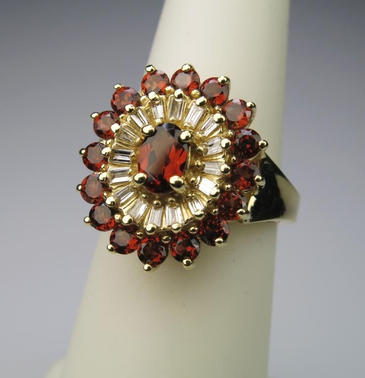 Striking Red Garnet and Diamond Ring with 17 channel set garnets weighing approx. 2.00 carats and 16 baguette diamonds weighing approx. 0.60 carats of G-H colors and VS/SI clarity set in 14 karat yellow gold. Retail $800-$1,400 Estimate$400-$500