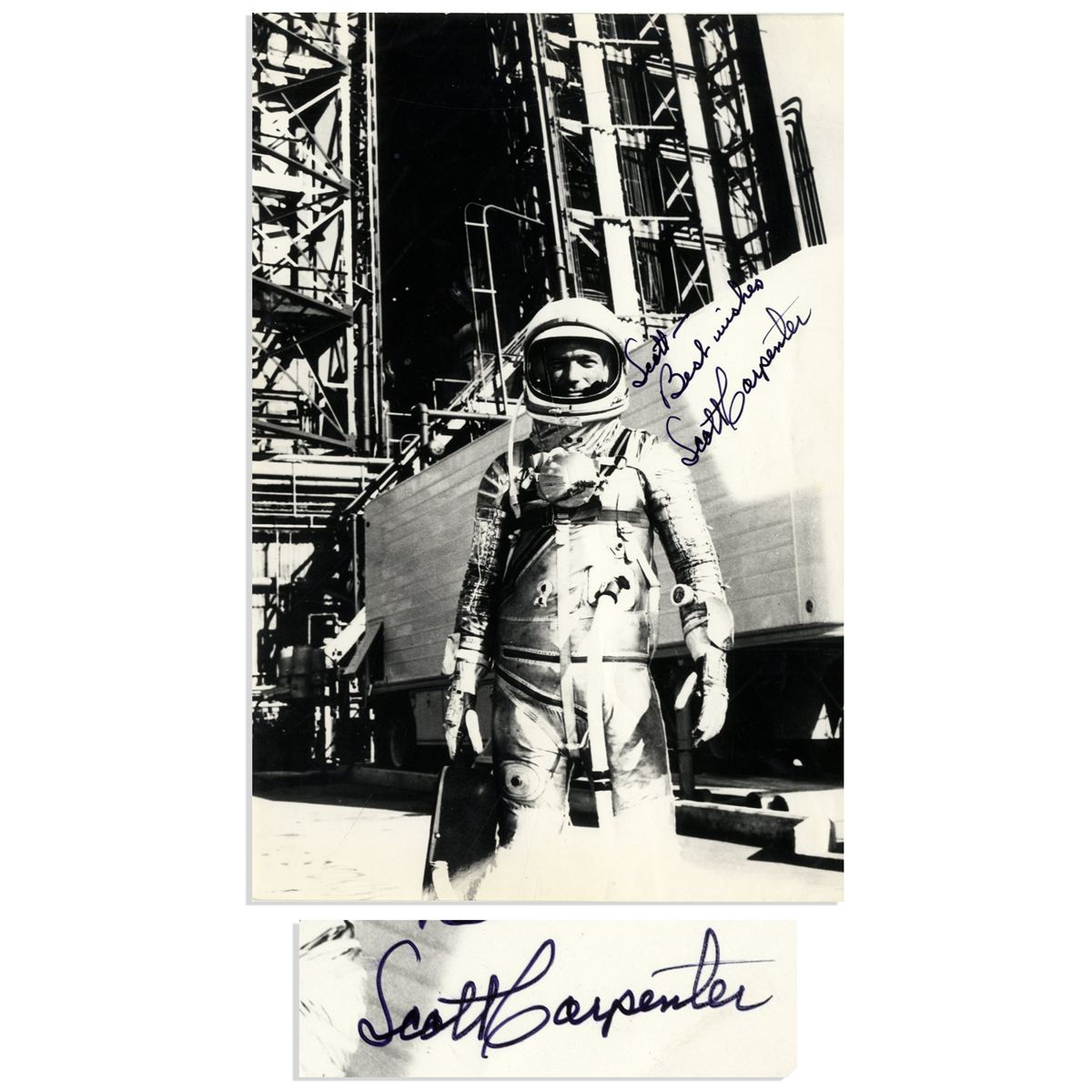 Scott Carpenter photo signed. Dramatic black and white glossy photo of the Gemini and Apollo astronaut wearing his spacesuit is inscribed in black felt tip, ''Scott - Best wishes / Scott Carpenter''. Measures 6.5'' x 8.25''. Creasing, else near fine.