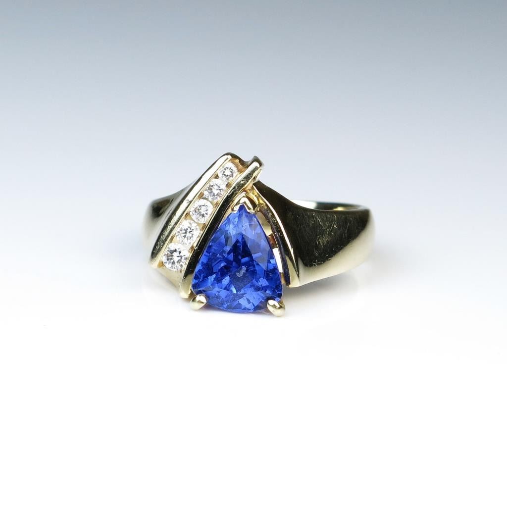 Features a brilliant cut Tanzanite weighing approx. 3.50 carats and 5 "IDEAL' cut Diamonds weighing approx. 0.30 carats with F-G colors and VS clarity set in a 14 karat yellow gold custom made setting.