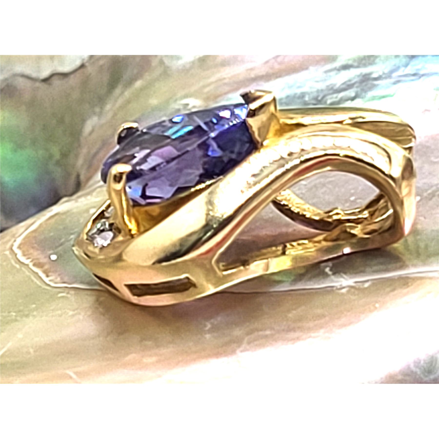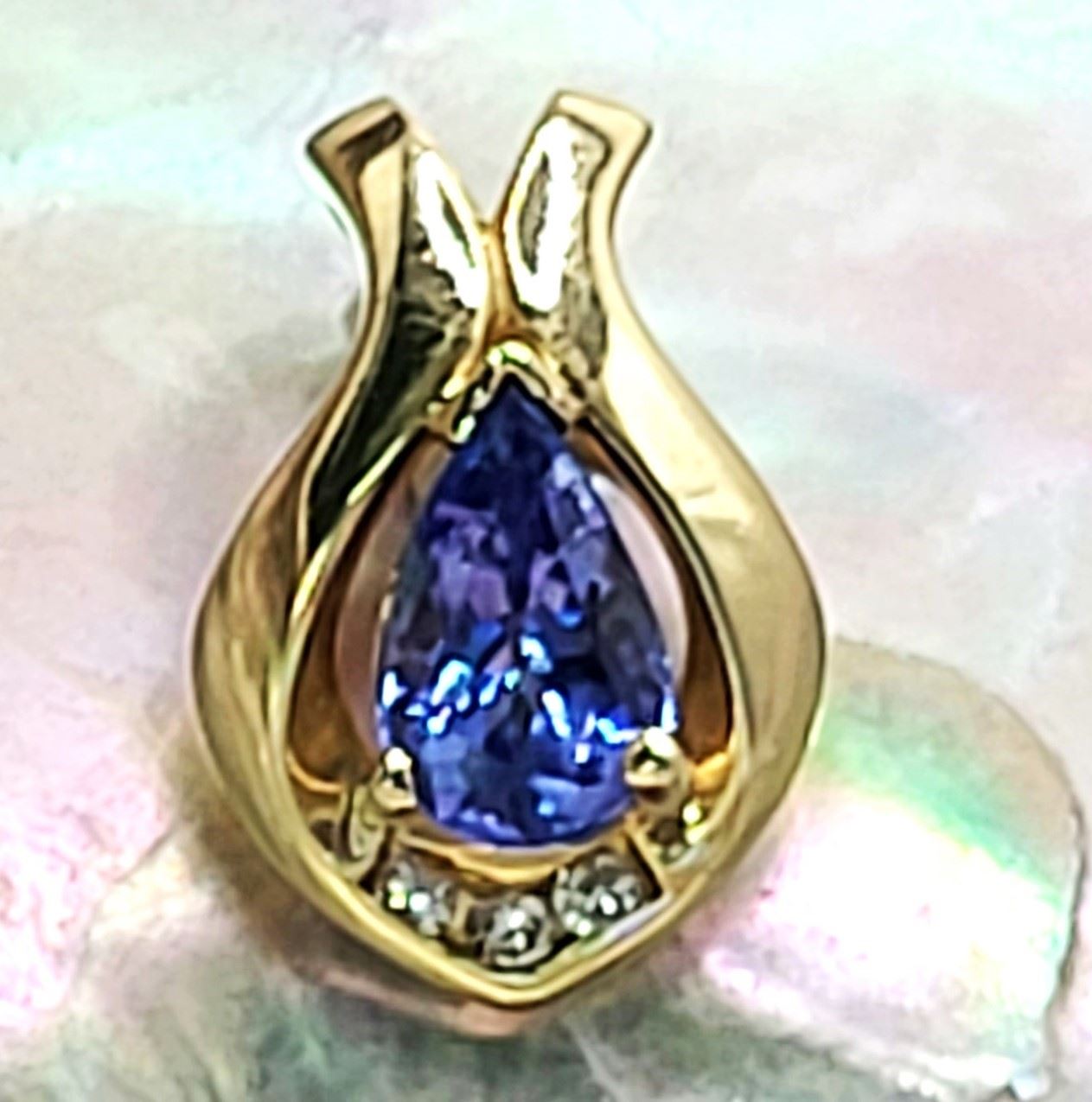 This is a 14 karat yellow gold pendant that features a 1.12 carat pear-cut, prong-set, rich bluish purple, genuine tanzanite. Channel-set at the bottom of the curvy yellow gold frame are .05 carats of round, brilliant-cut, H, SI2 clarity accent diamonds. The pendant is approximately 5/8& quot; diameter and has a built-in bail that can accommodate an approximate 3.75mm wide chain.& nbsp; Admin: G11241/15grt