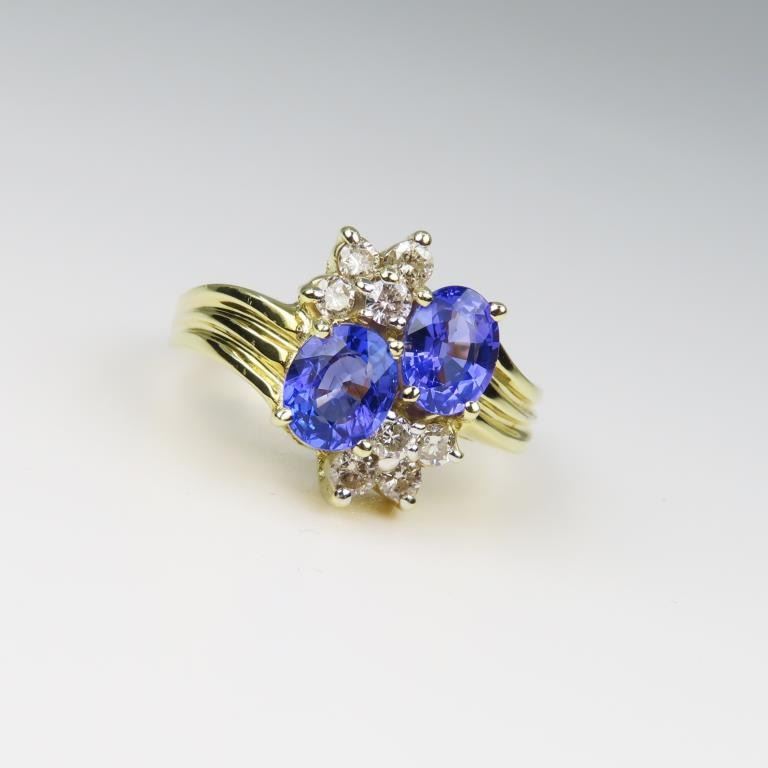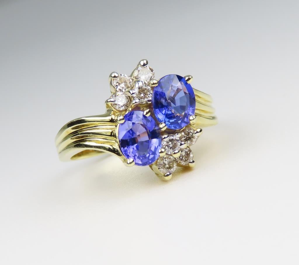 featuring 2 matching oval cut Tanzanites weighing approx. 1.50 carats accented with 8 Diamonds weighing approx. 0.30 carats with H-I colors set in a 14 karat yellow gold setting, Size 6 ¼.