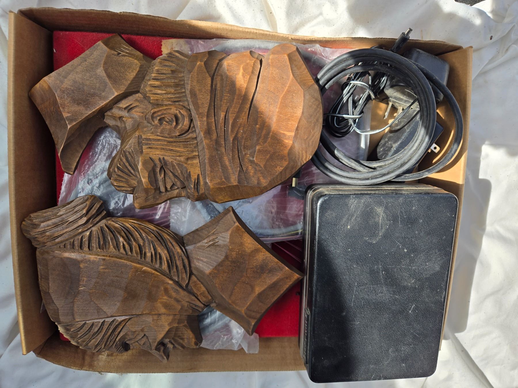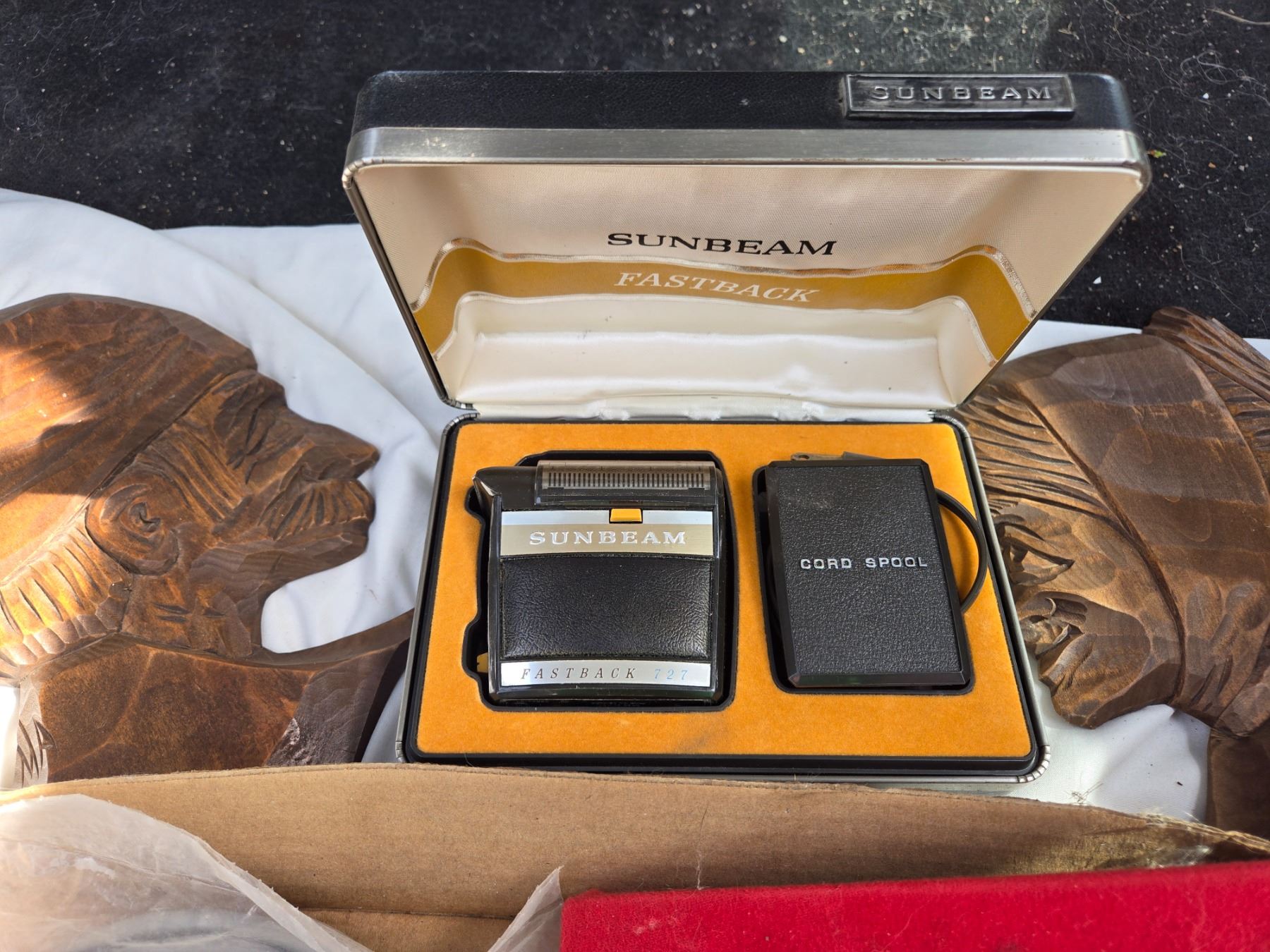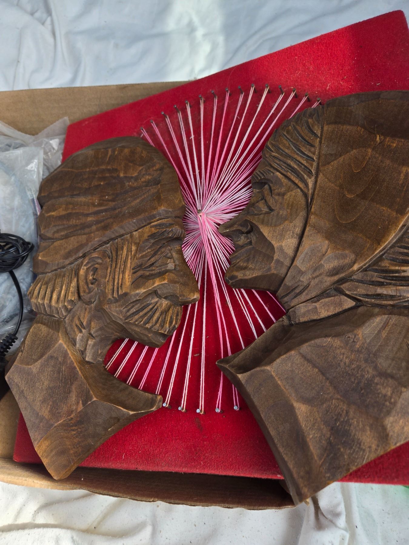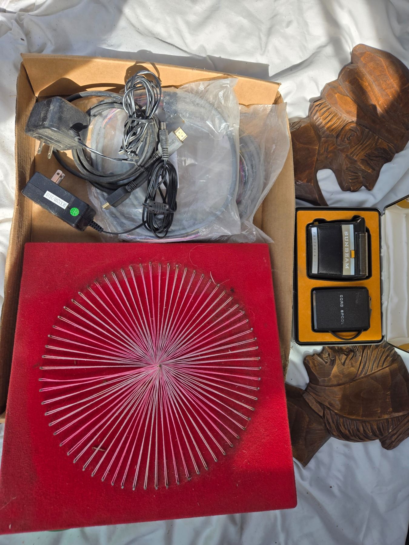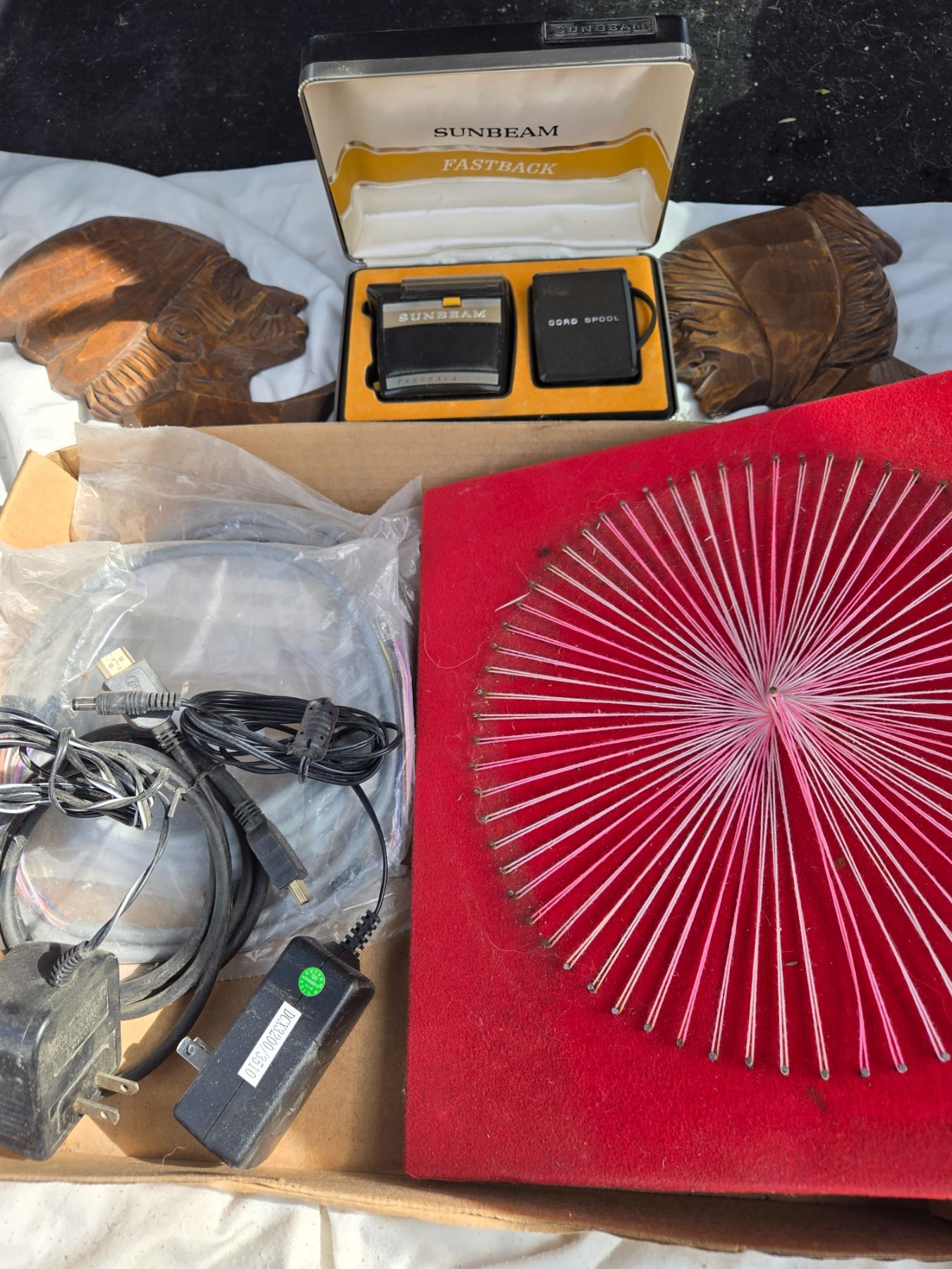 String Art, Carved Heads, Working Vintage Sunbeam Razor, Misc Cords
