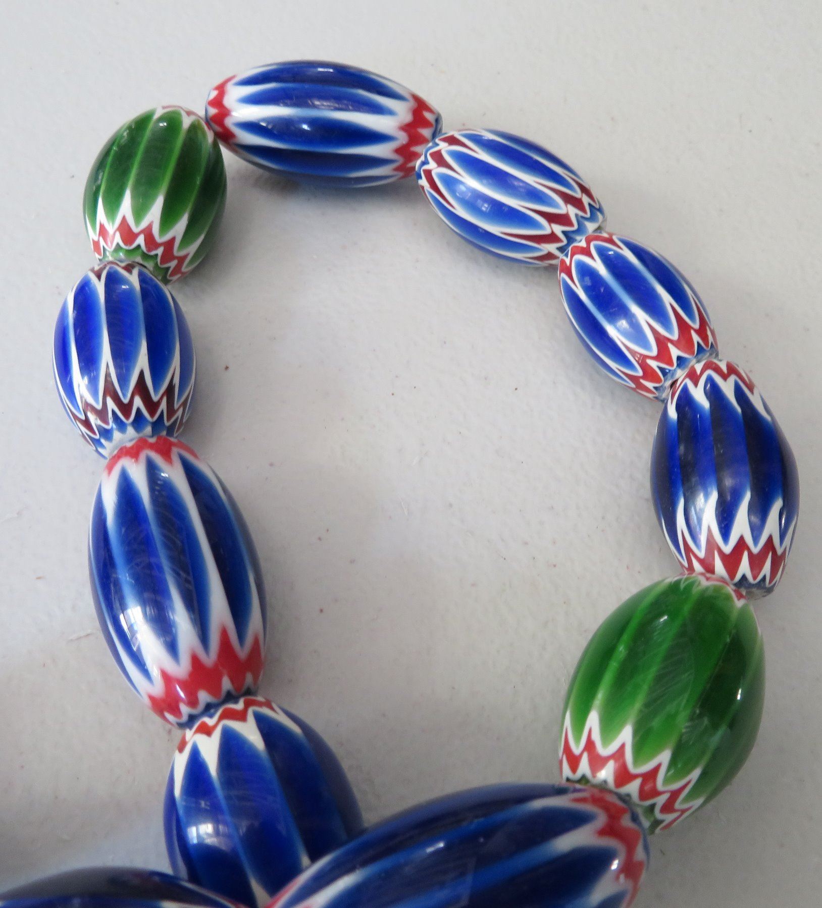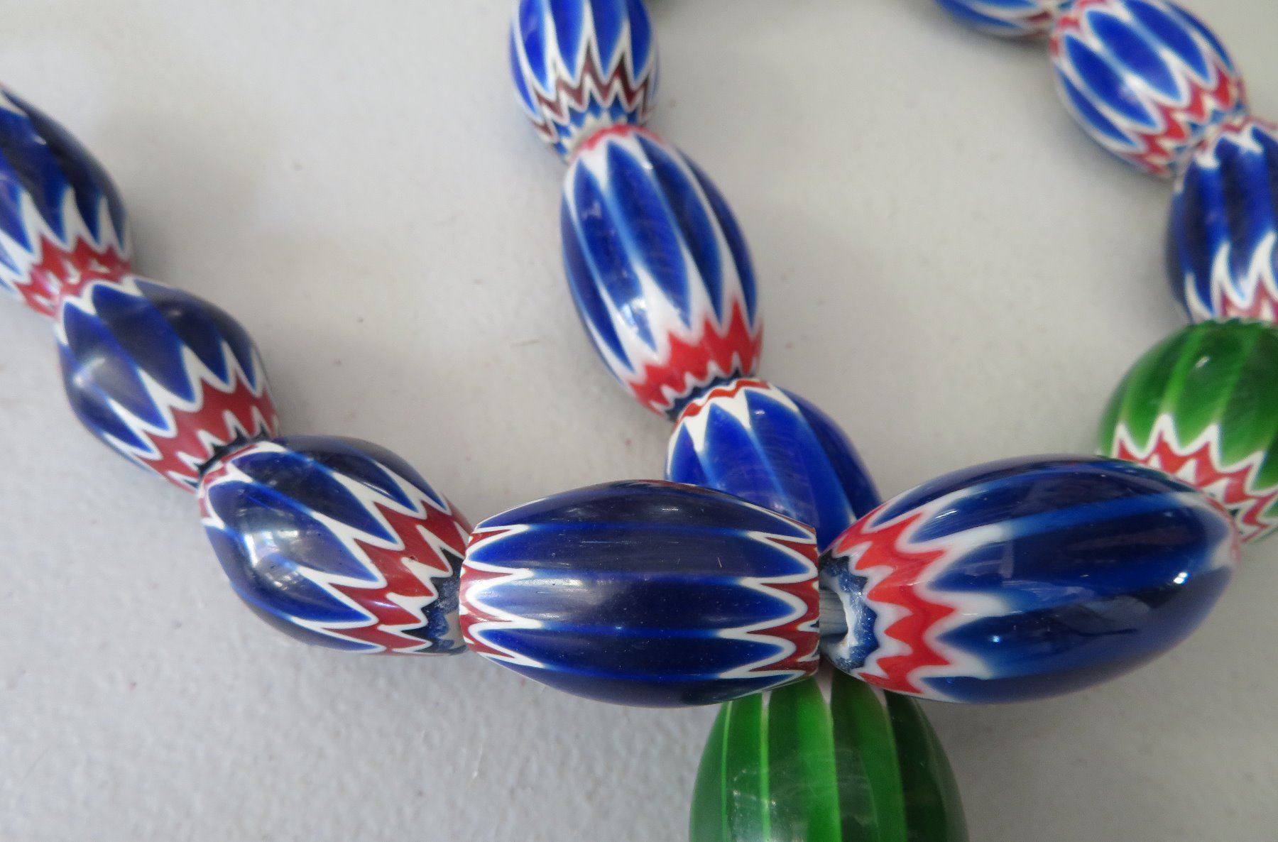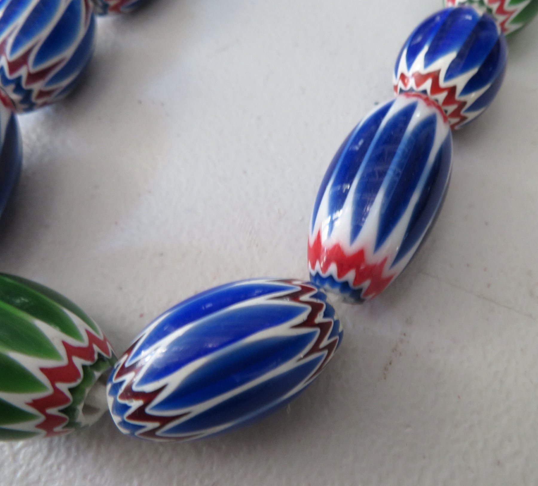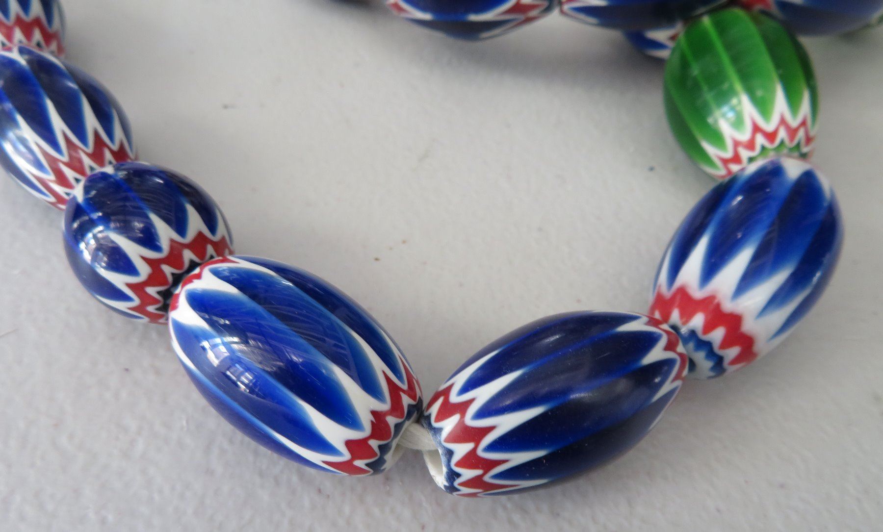 String of Chevron Beads, 20th century items. Made of glass, the string measures approx. 30" overall. Italy. Five and six layer red, white and blue as well as red, white and green chevron beads. Condition: Good, see images. Shipping: $24.50 w/insurance and signature, due to size and value.