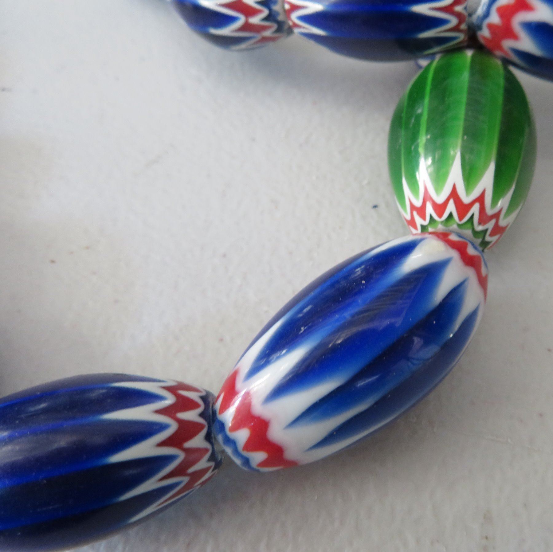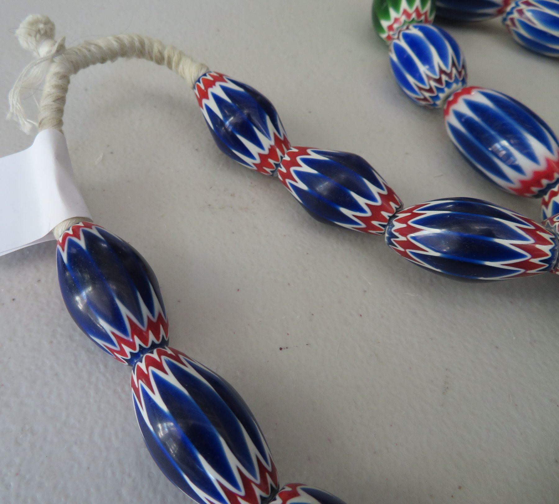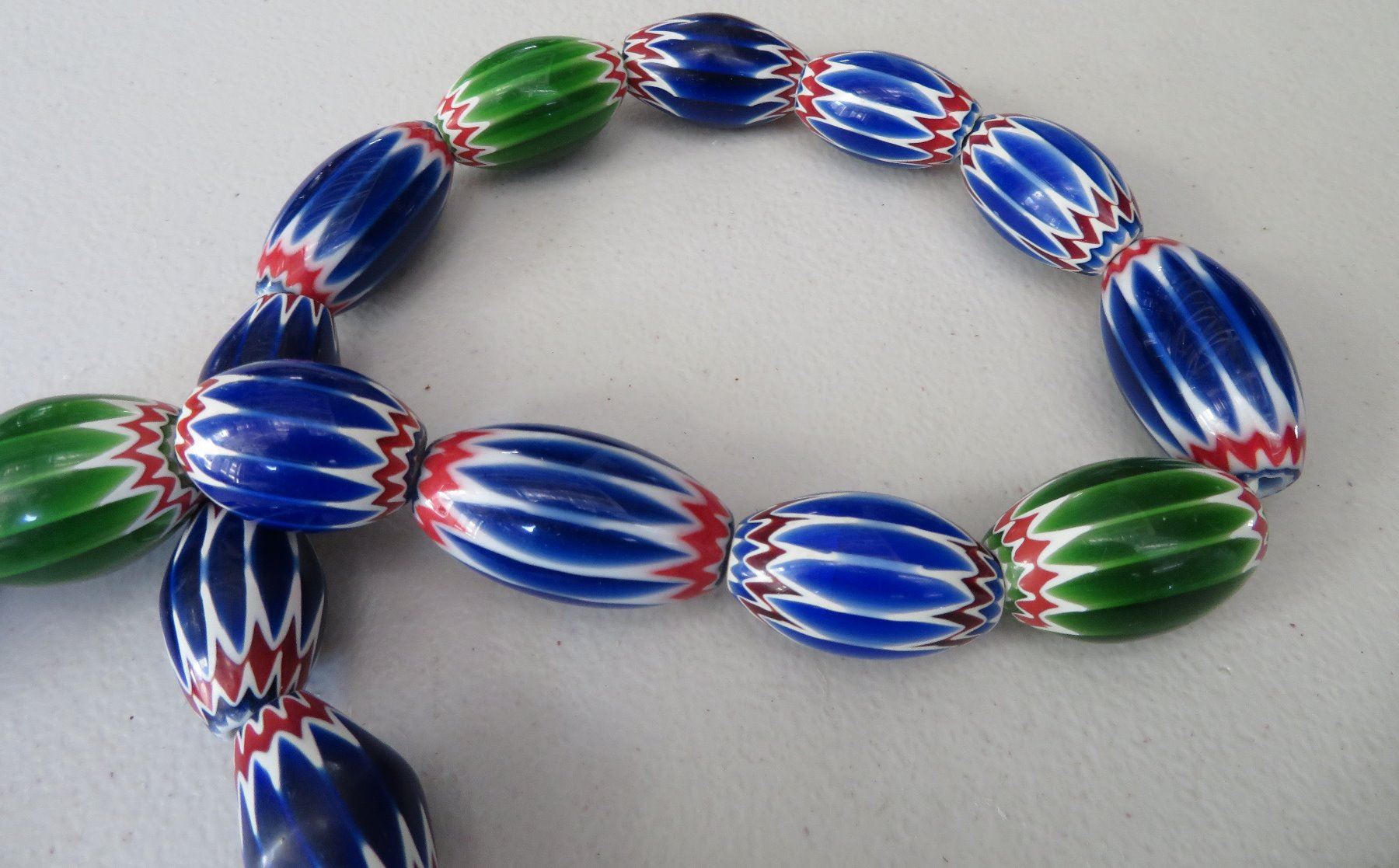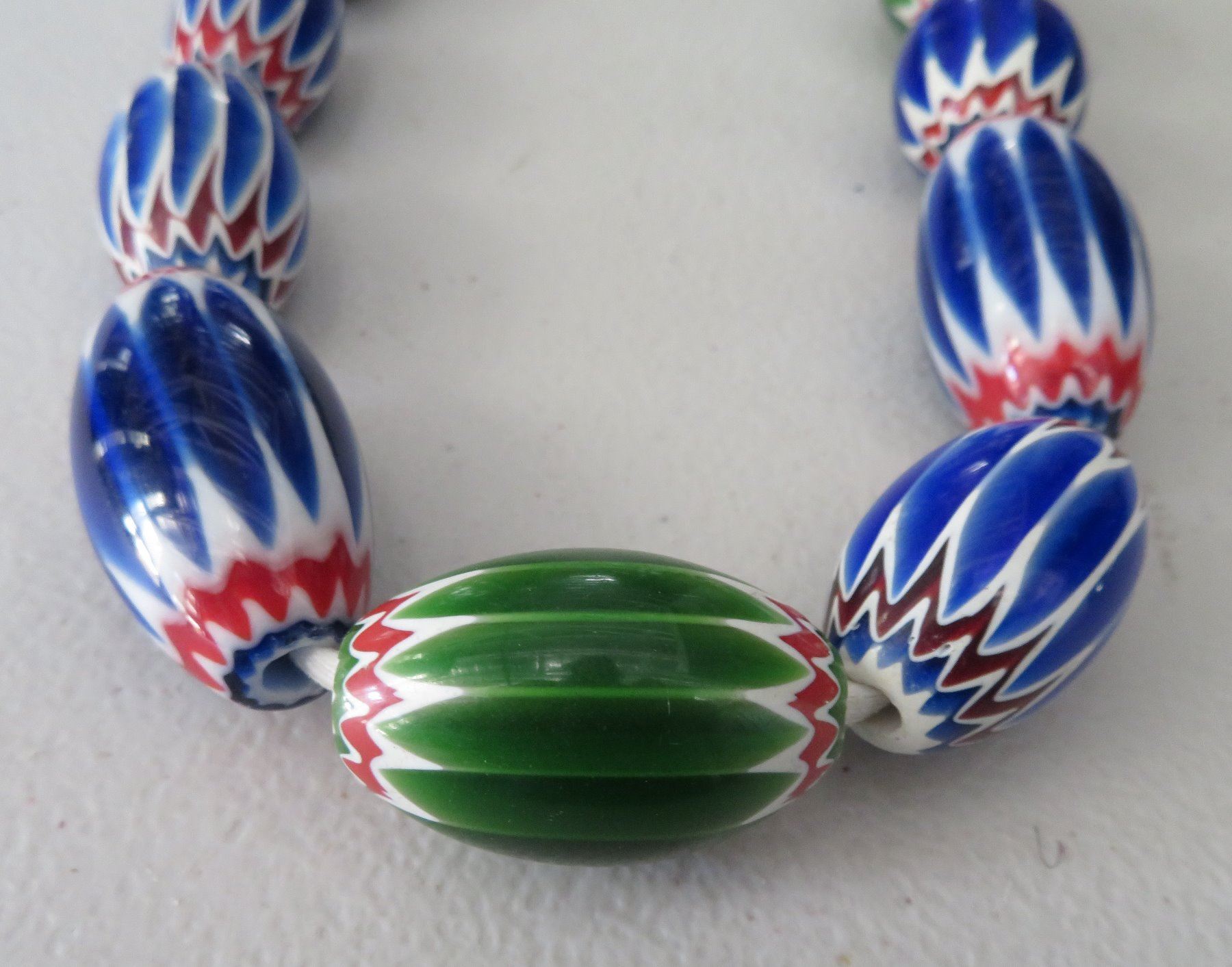 String of Chevron Beads, 20th century items. Made of glass, the string measures approx. 30" overall. Italy. Five and six layer red, white and blue as well as red, white and green chevron beads. Condition: Good, see images. Shipping: $24.50 w/insurance and signature, due to size and value.