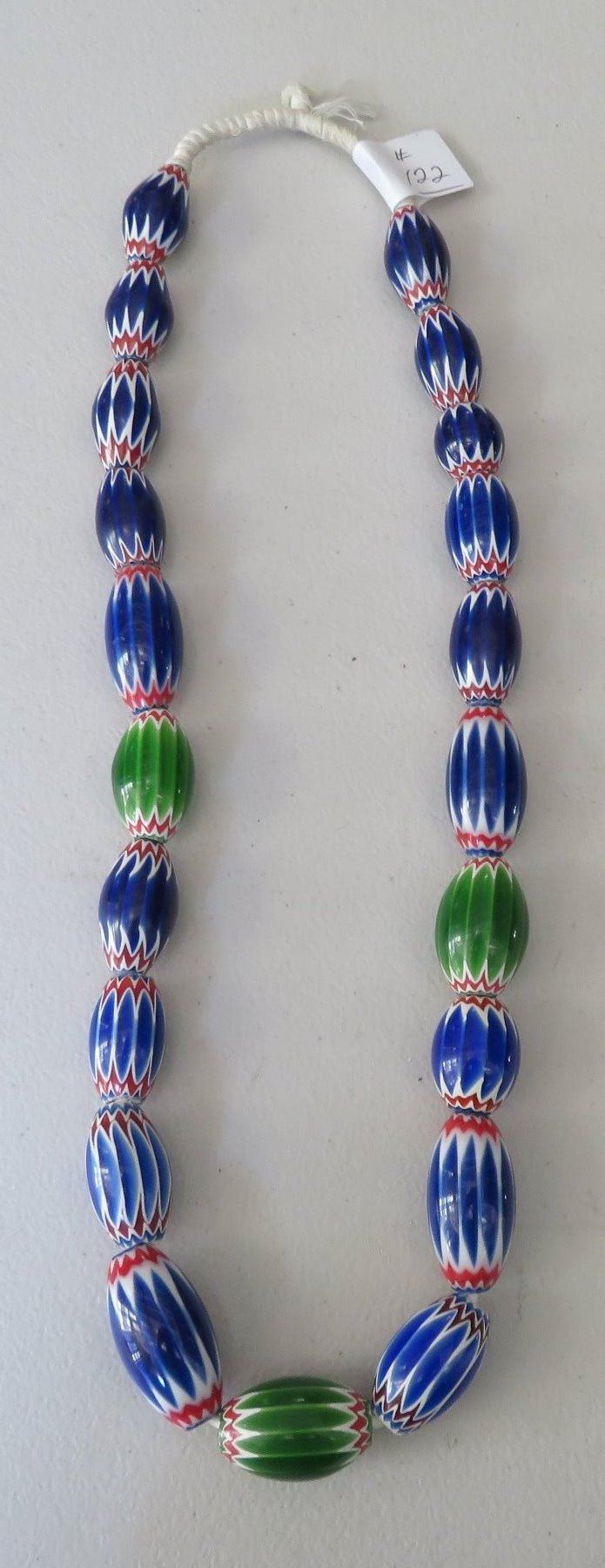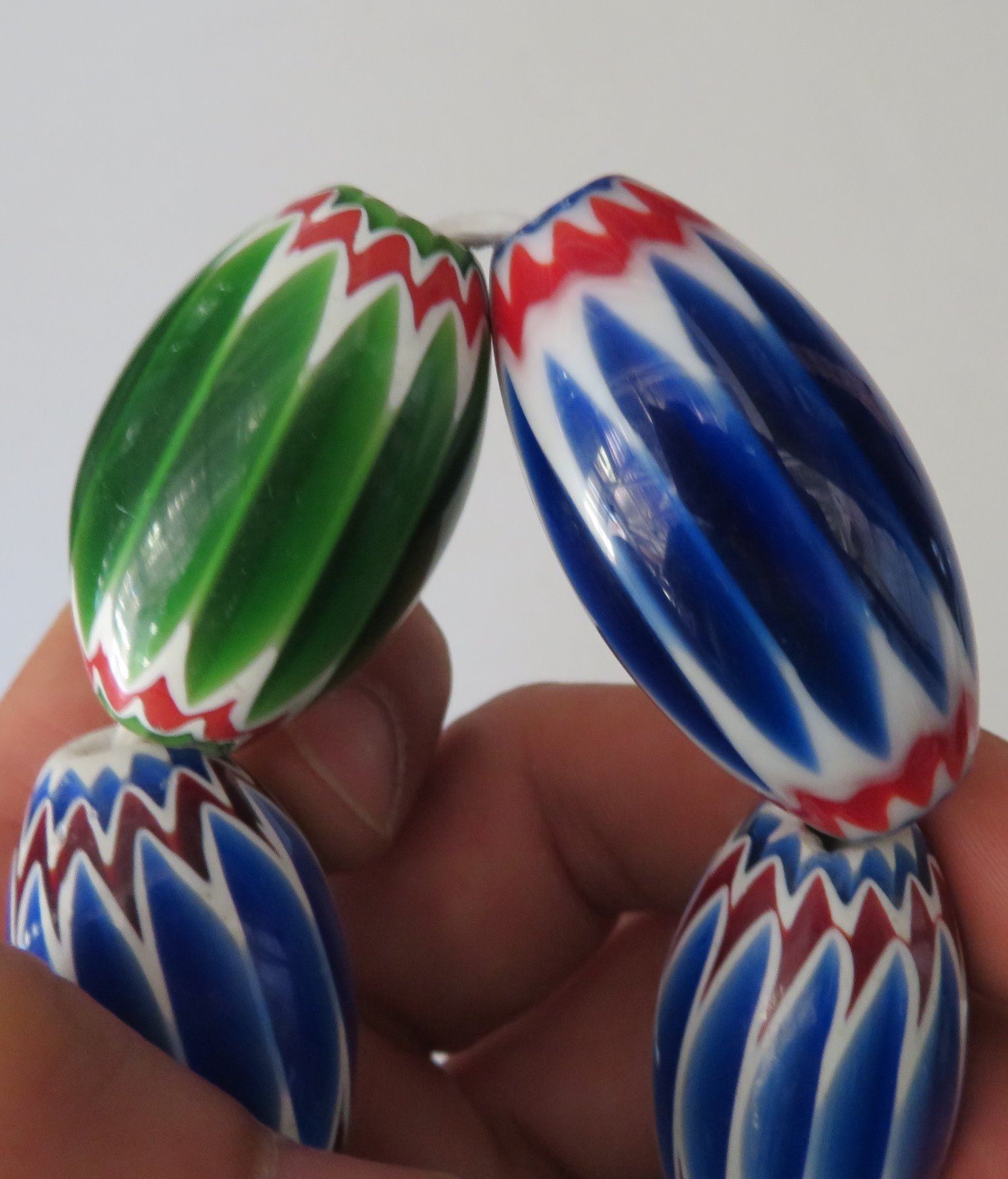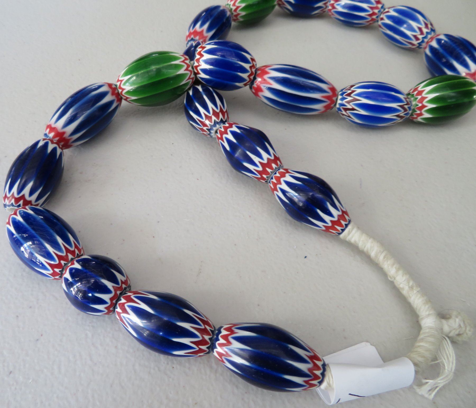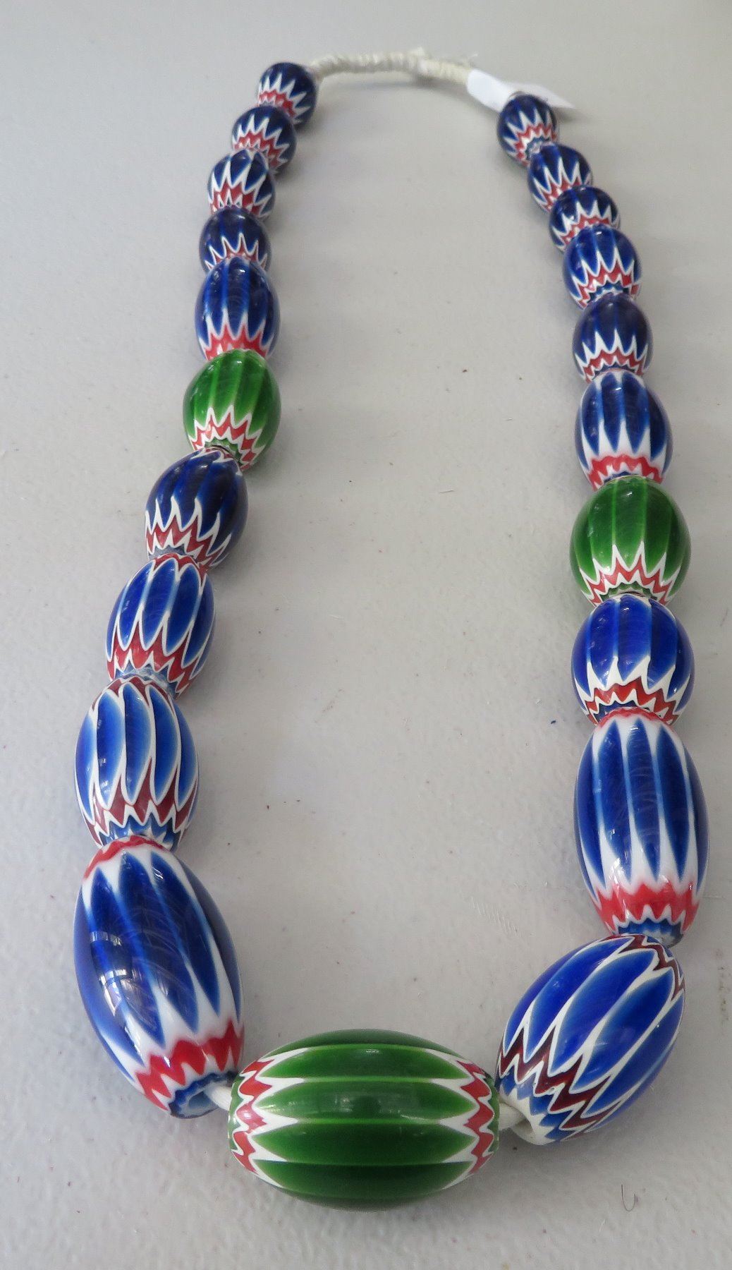 String of Chevron Beads, 20th century items. Made of glass, the string measures approx. 30" overall. Italy. Five and six layer red, white and blue as well as red, white and green chevron beads. Condition: Good, see images. Shipping: $24.50 w/insurance and signature, due to size and value.