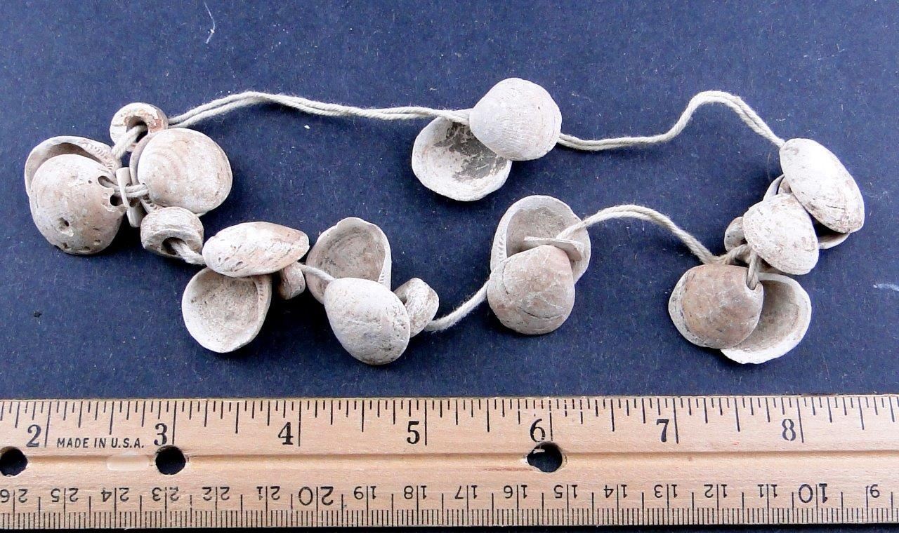 Description: A short modern string of 17 whole shells (not beads) with shell bead and cardboard? spacers. Illustrated in Opitz, p. 364.