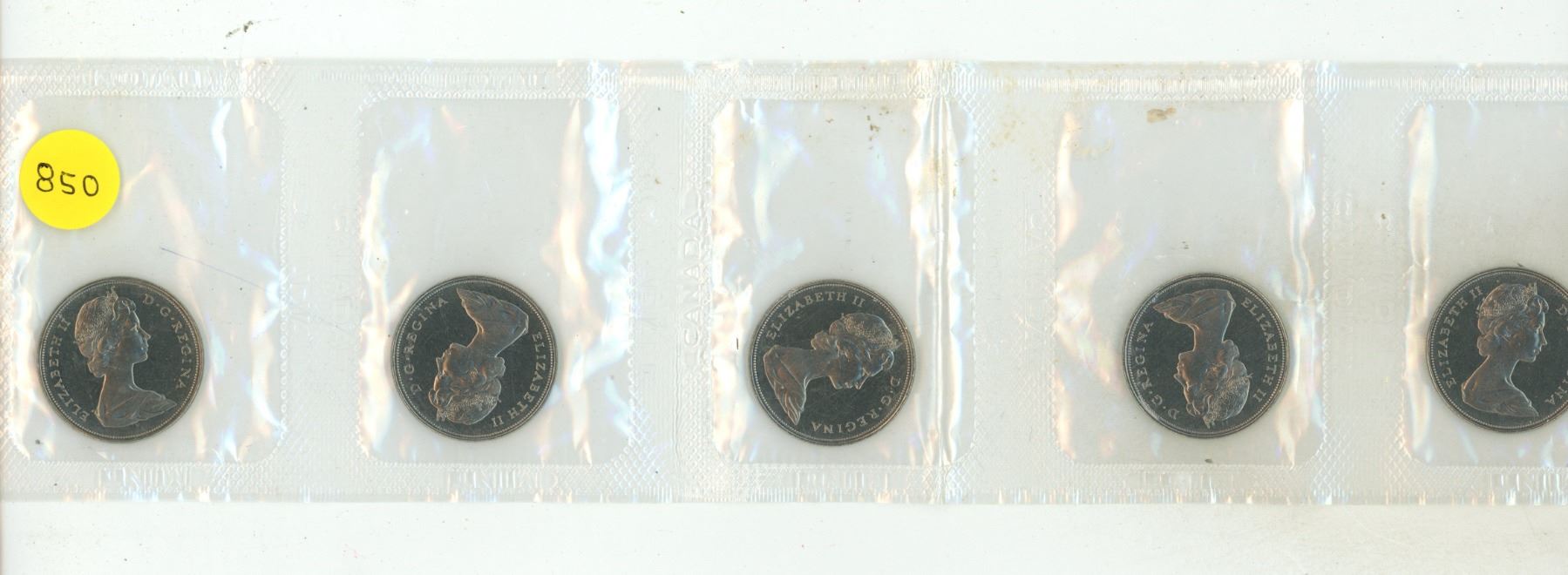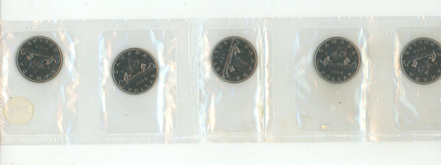 Strip of 5 1968 Canadian Nickel Dollars. Housed in its original Royal Canadian Mint plastic.