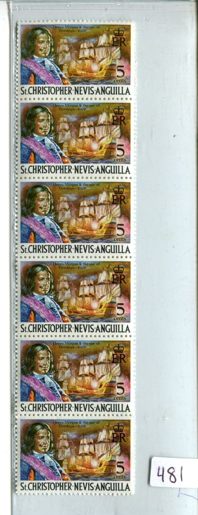Strip of 6 St. Christopher, Nevis & Anguilla 5 Cents Stamps depicting the Pirate Henry Morgan and his Fire Ships. Mint.